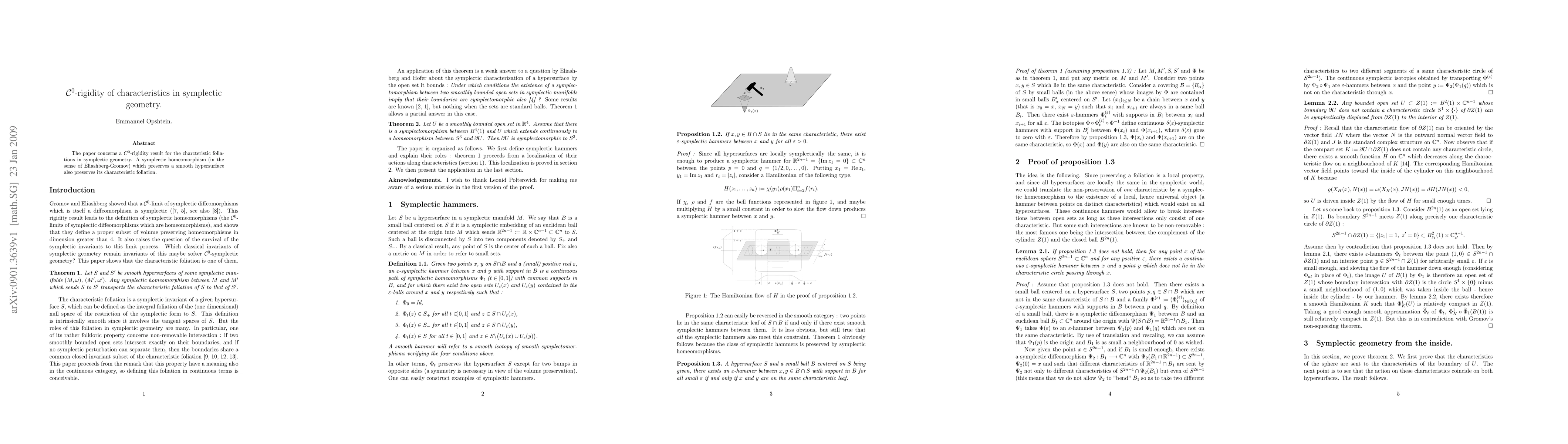 The paper concerns a $C^0$-rigidity result for the charcteristic foliations in symplectic geometry. A symplectic homeomorphism (in the sense of Eliashberg-Gromov) which preserves a smooth hypersurface also preserves its characteristic foliation.