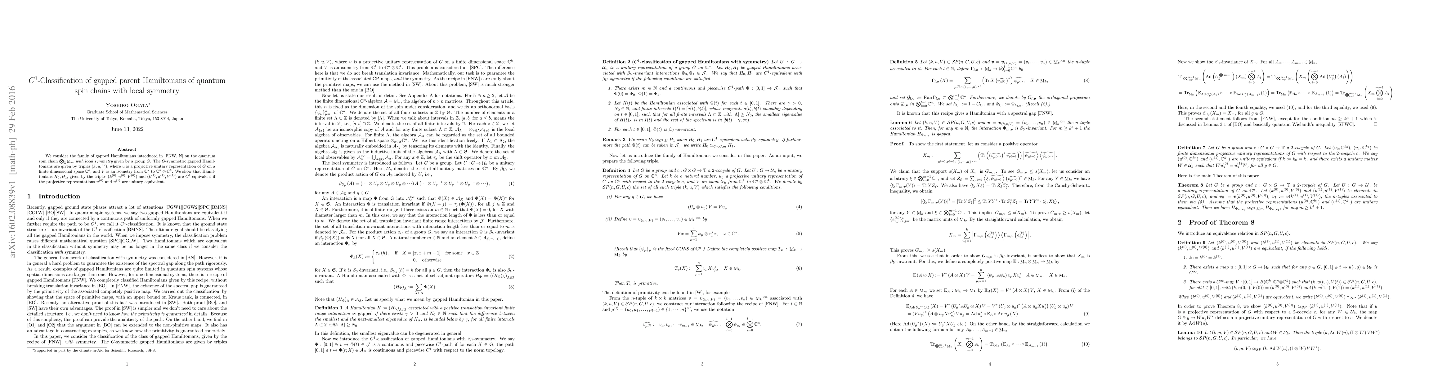 We consider the family of gapped Hamiltonians introduced in [FNW] on the quantum spin chains $\bigotimes_{\mathbb Z}\mathop{\mathrm{M}}\nolimits_n$, with local symmetry given by a group $G$. The $G$-symmetric gapped Hamiltonians are given by triples $(k,u,V)$, where $u$ is a projective unitary representation of $G$ on a finite dimensional space ${\mathbb C}^k$, and $V$ is an isometry from ${\mathbb C}^k$ to ${\mathbb C}^n\otimes {\mathbb C}^k$. We show that Hamiltonians $H_0,H_1$, given by the triples $(k^{(0)}, u^{(0)}, V^{(0)})$ and $(k^{(1)}, u^{(1)}, V^{(1)})$ are $C^1$-equivalent if the projective representations $u^{(0)}$ and $u^{(1)}$ are unitary equivalent.