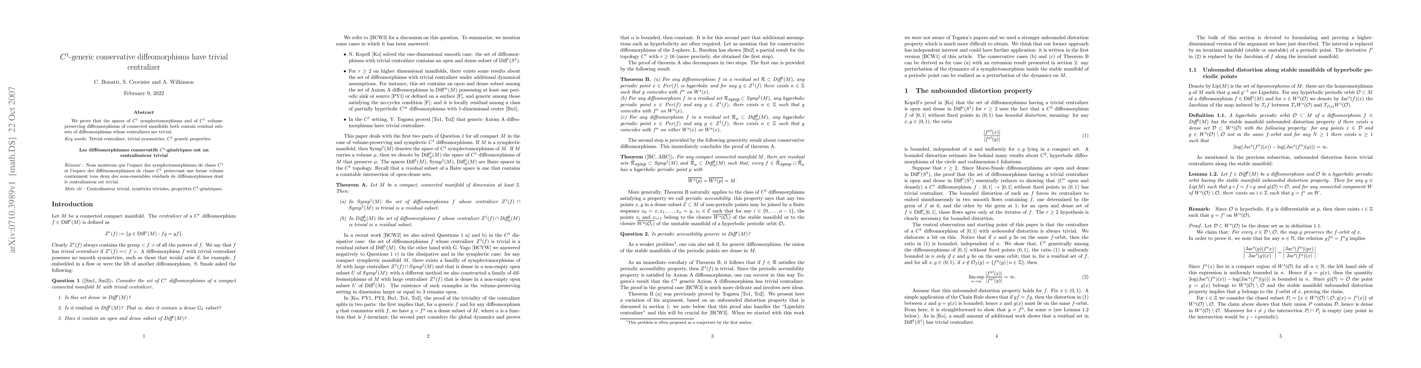 We prove that the spaces of C1 symplectomorphisms and of C1 volume-preserving diffeomorphisms of connected manifolds both contain residual subsets of diffeomorphisms whose centralizers are trivial. (Les diff\'eomorphismes conservatifs C1-g\'en\'eriques ont un centralisateur trivial. Nous montrons que l'espace des symplectomorphismes de classe C1 et l'espace des diff\'eomomorphismes de classe C1 pr\'eservant une forme volume contiennent tous deux des sous-ensembles r\'esiduels de diff\'eomorphismes dont le centralisateur est trivial.)