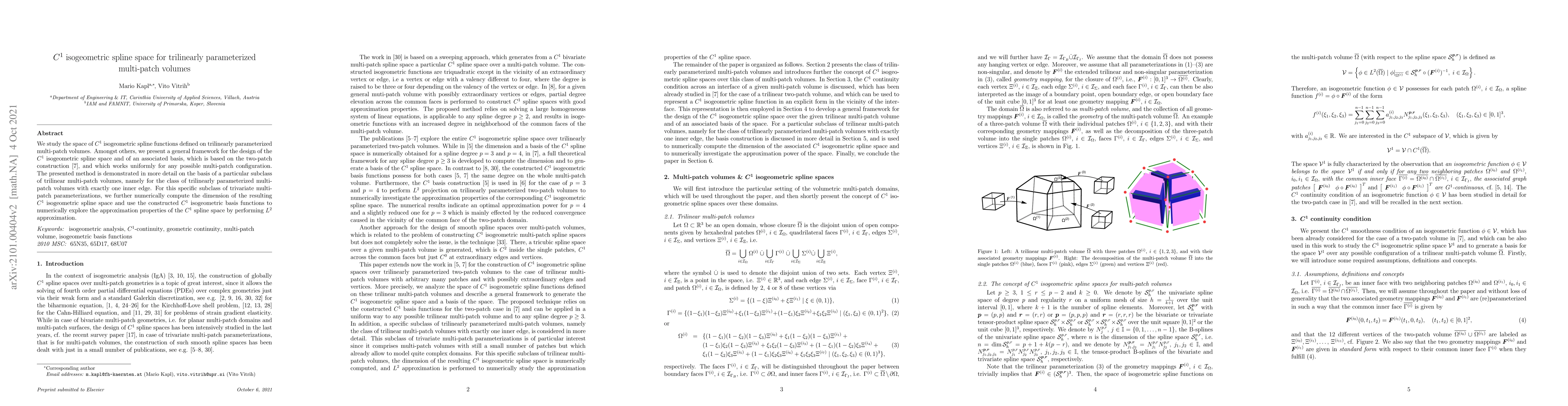 This paper develops a $C^1$ isogeometric spline space for trilinearly parameterized multi-patch volumes, presenting a general framework for its design and basis. It focuses on a subclass with one inner edge, computing its dimension and exploring its approximation properties through $L^2$ approximation.