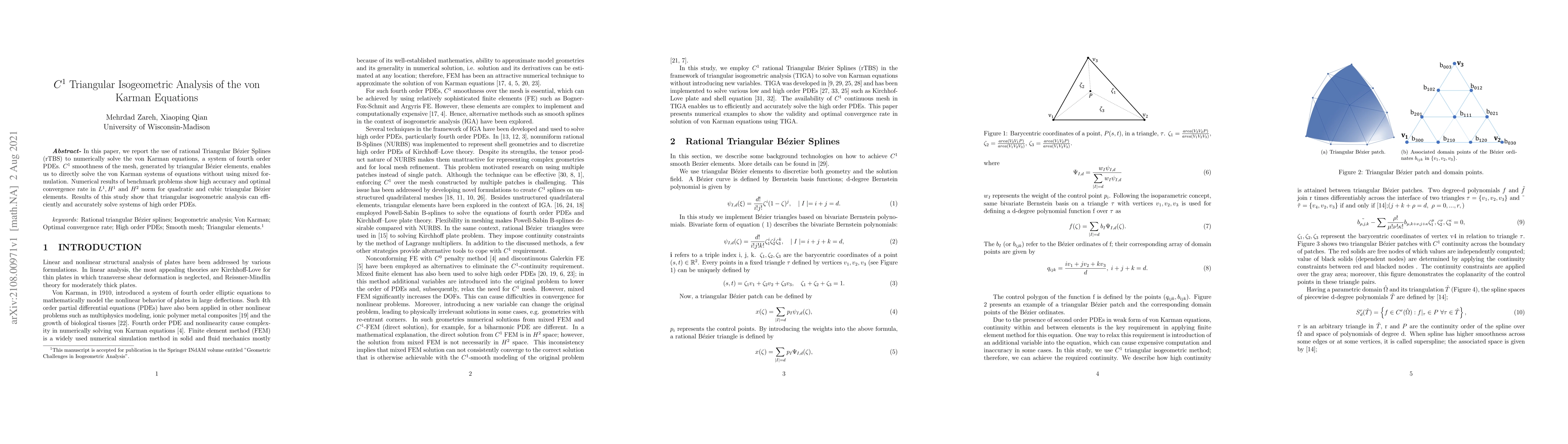 This paper employs rational Triangular Bezier Splines to numerically solve the von Karman equations, demonstrating high accuracy and optimal convergence rates using $C^{1}$ smooth triangular meshes. The study shows that triangular isogeometric analysis is effective for solving high-order PDE systems.
