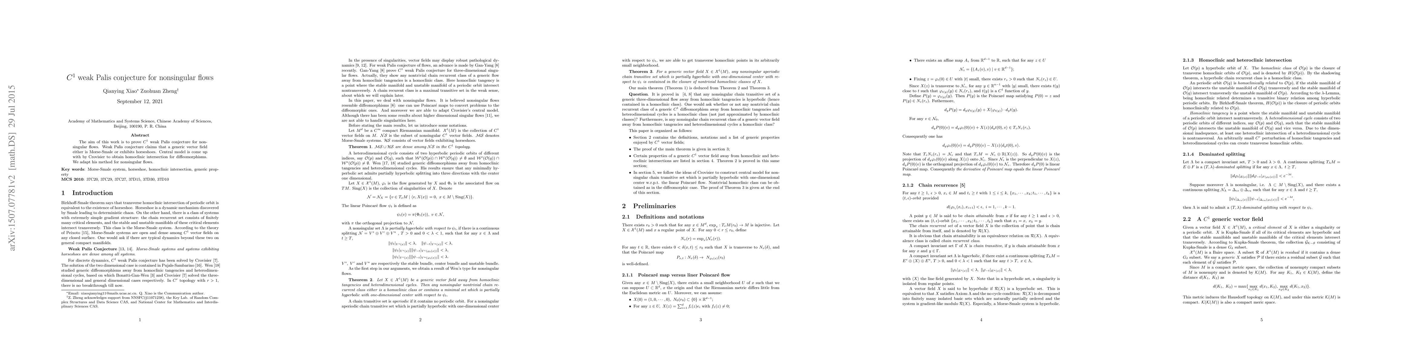 The aim of this work is to prove $C^1$ weak Palis conjecture for nonsingular flows. Weak Palis conjecture claims that a generic vector field either is Morse-Smale or exhibits horseshoes. Central model is come up with by Crovisier to obtain homoclinic intersection for diffeomorphisms. We adapt his method for nonsingular flows.