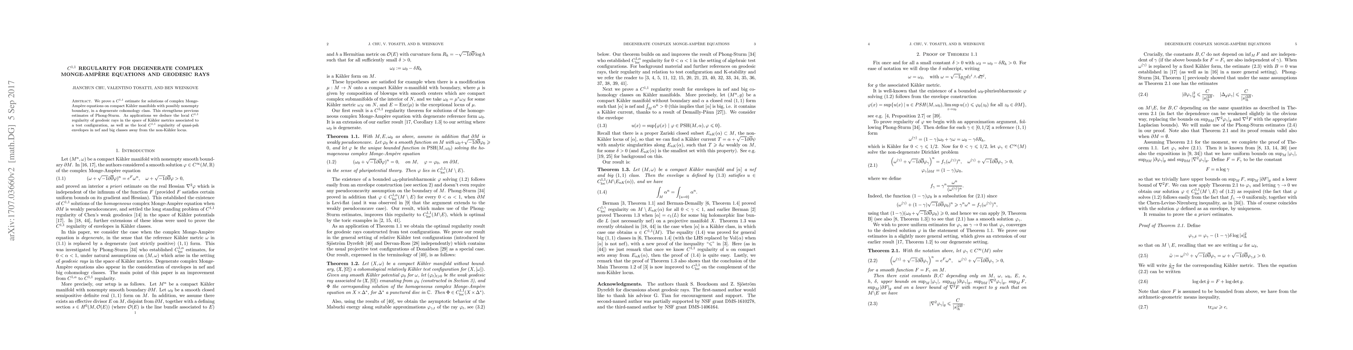 This paper proves $C^{1,1}$ regularity for solutions of degenerate complex Monge-Ampère equations on compact Kähler manifolds, enhancing prior estimates. The findings also demonstrate the $C^{1,1}$ regularity of geodesic rays in Kähler metric spaces and quasi-psh envelopes in nef and big classes.