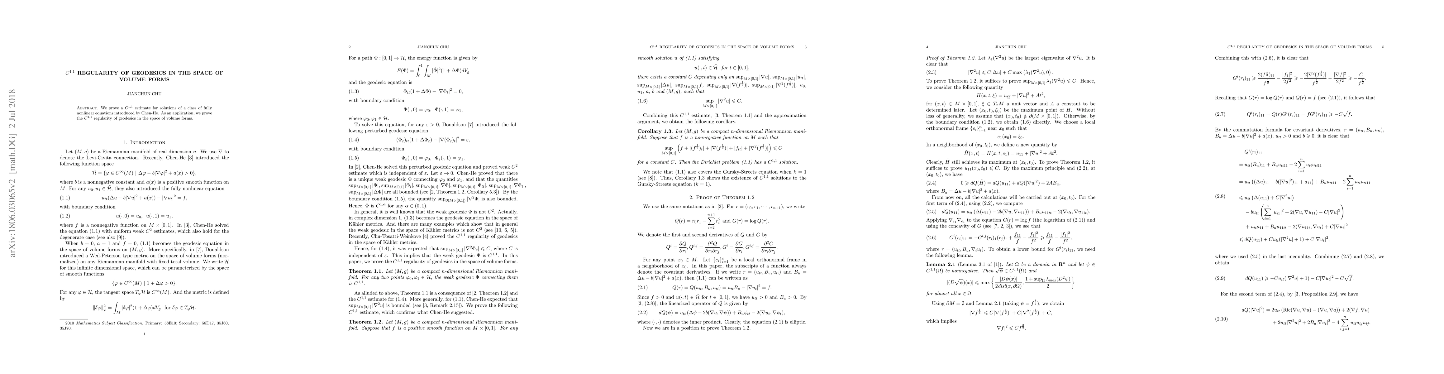 This paper establishes a $C^{1,1}$ regularity estimate for solutions to a class of fully nonlinear equations, and applies this result to demonstrate the $C^{1,1}$ regularity of geodesics in the space of volume forms.