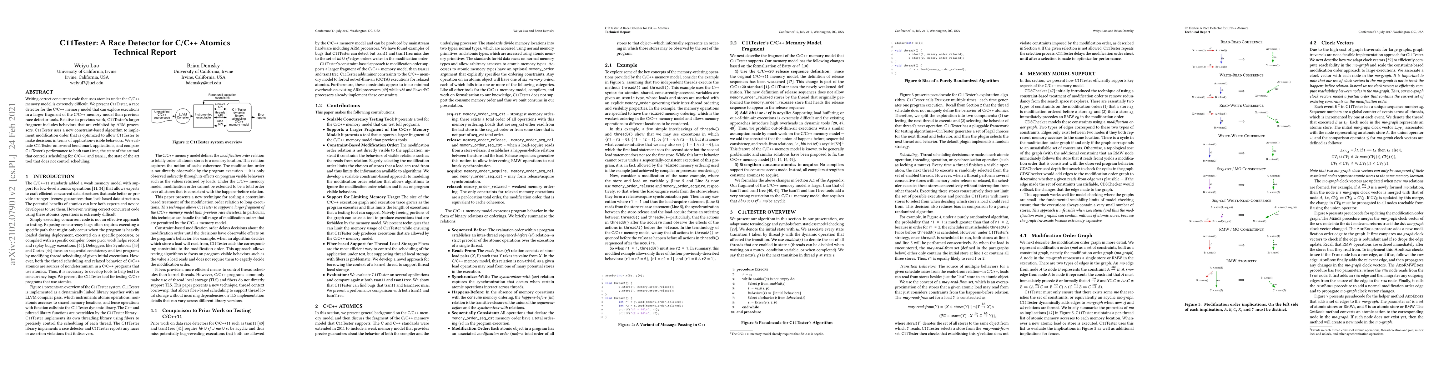 C11Tester is a race detector for C/C++ atomics that explores a larger fragment of the C/C++ memory model, including behaviors specific to ARM processors, using a new constraint-based algorithm. It is evaluated against state-of-the-art tools, showing competitive performance.