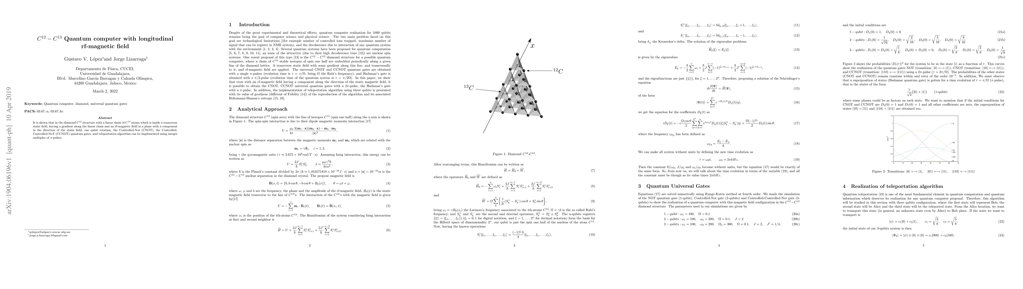 Researchers have successfully demonstrated a quantum computer using a diamond C12 structure with C13 atoms in a transverse static field and rf-magnetic field, enabling basic quantum operations like qubit rotation, CNOT, CCNOT, and teleportation.