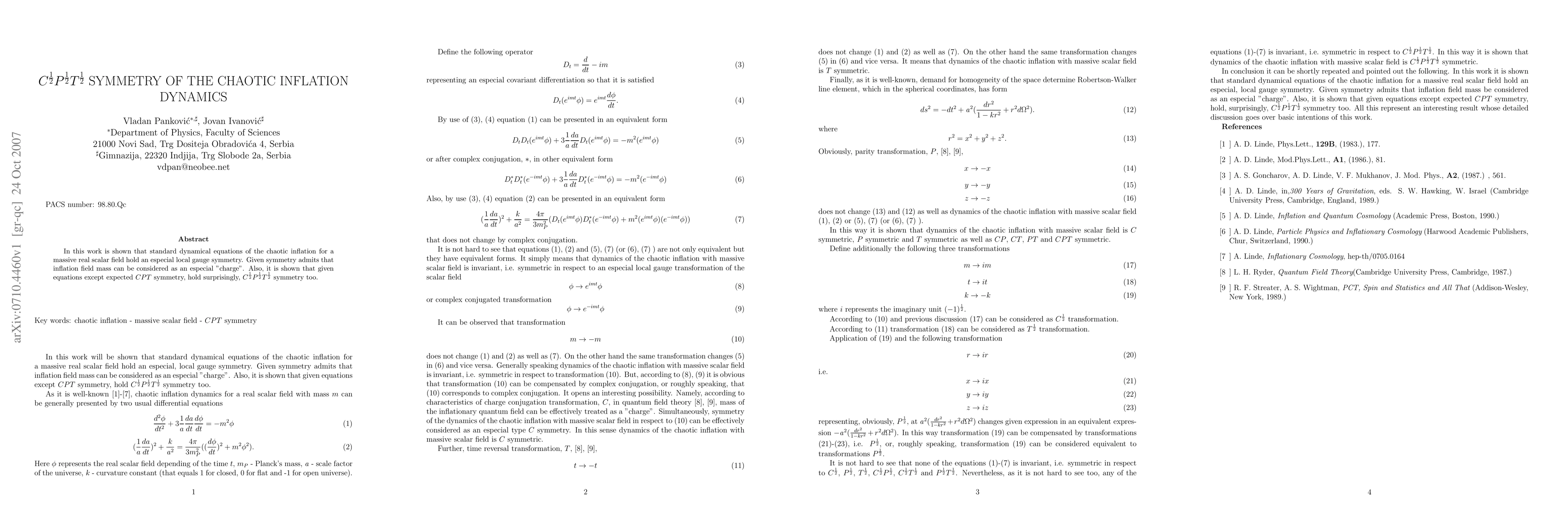 In this work is shown that standard dynamical equations of the chaotic inflation for a massive real scalar field hold an especial local gauge symmetry. Given symmetry admits that inflation field mass can be considered as an especial "charge". Also, it is shown that given equations except expected $CPT$ symmetry, hold surprisingly, $C^{{1/2}}P^{{1/2}}T^{{1/2}}$ symmetry too.