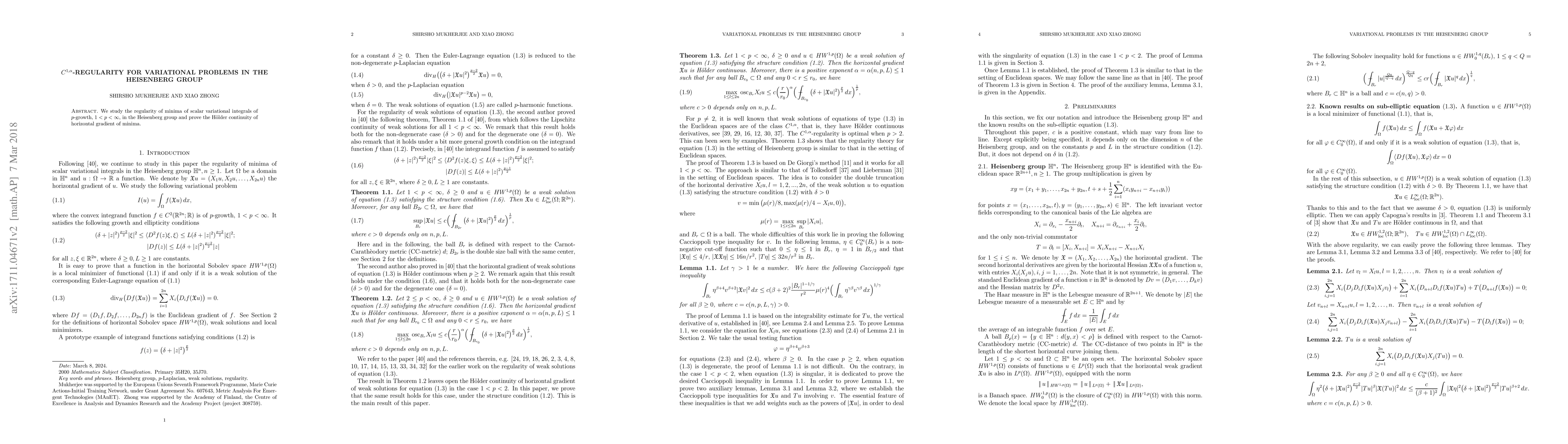 The paper presents a detailed proof of Hölder regularity for solutions to variational problems, utilizing advanced techniques from geometric analysis and PDE theory in the context of the Heisenberg group.