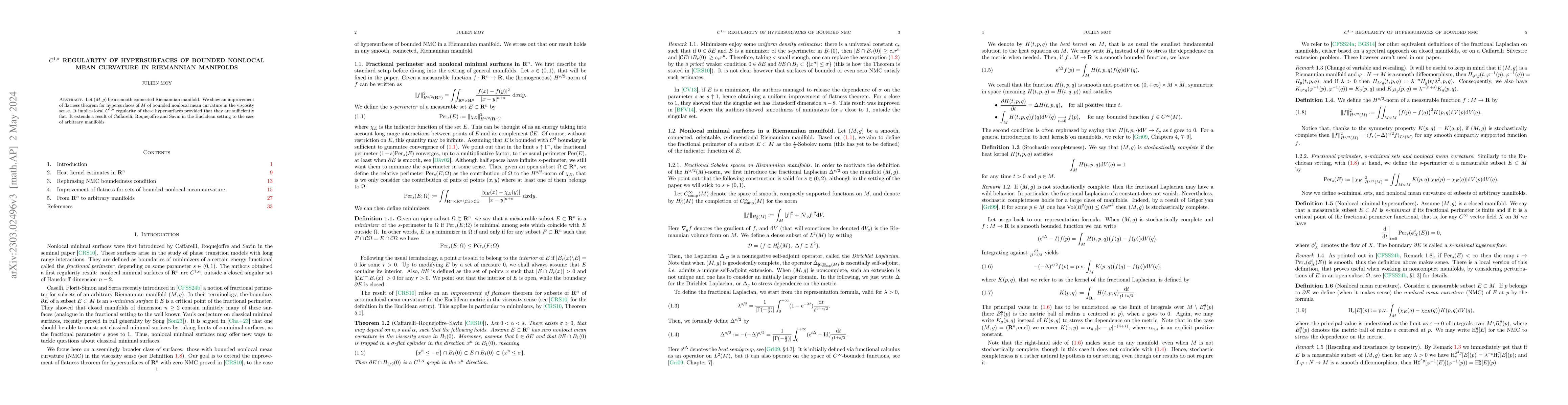 This paper proves $C^{1,\alpha}$ regularity for hypersurfaces in Riemannian manifolds with bounded nonlocal mean curvature, extending results from the Euclidean setting to more general settings. The improvement ensures local flatness under certain conditions.