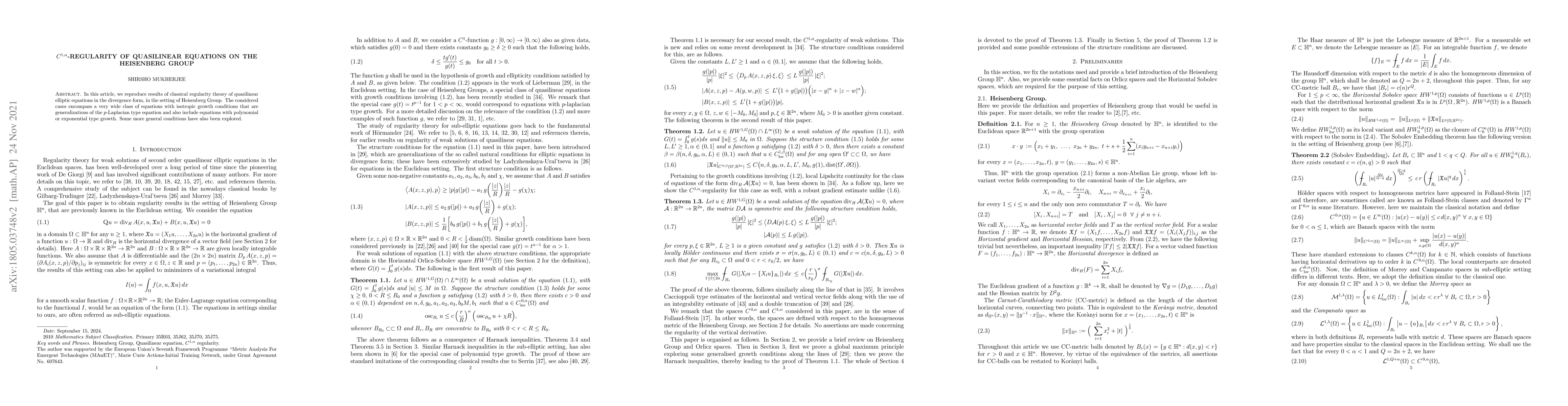 In this article, we reproduce results of classical regularity theory of quasilinear elliptic equations in the divergence form, in the setting of Heisenberg Group. The considered cases encompass a very wide class of equations with isotropic growth conditions that are generalizations of the $p$-Laplacian type equation and also include equations with polynomial or exponential type growth. Some more general conditions have also been explored.