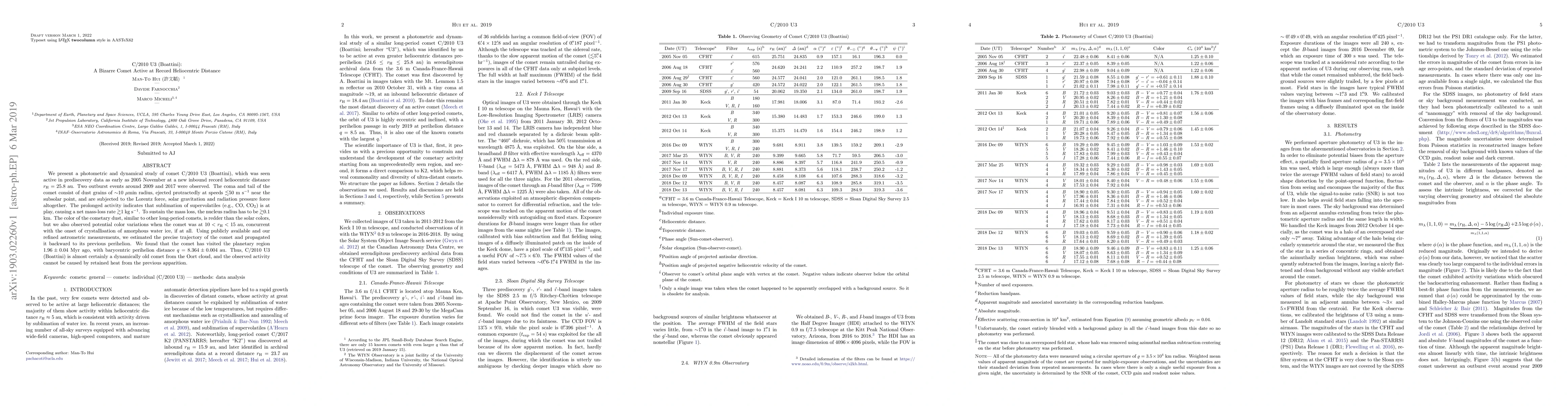 We present a photometric and dynamical study of comet C/2010 U3 (Boattini), which was seen active in prediscovery data as early as 2005 November at a new inbound record heliocentric distance $r_{\rm H} = 25.8$ au. Two outburst events around 2009 and 2017 were observed. The coma and tail of the comet consist of dust grains of $\sim$10 $\mu$m in radius, ejected protractedly at speeds $\lesssim$50 m s$^{-1}$ near the subsolar point, and are subjected to the Lorentz force, solar gravitation and radiation pressure force altogether. The prolonged activity indicates that sublimation of supervolatiles (e.g., CO, CO$_2$) is at play, causing a net mass-loss rate $\gtrsim$1 kg s$^{-1}$. To sustain the mass loss, the nucleus radius has to be $\gtrsim$0.1 km. The color of the cometary dust, similar to other long-period comets, is redder than the solar colors, but we also observed potential color variations when the comet was at $10 < r_{\rm H} < 15$ au, concurrent with the onset of crystallisation of amorphous water ice, if at all. Using publicly available and our refined astrometric measurements, we estimated the precise trajectory of the comet and propagated it backward to its previous perihelion. We found that the comet has visited the planetary region $1.96 \pm 0.04$ Myr ago, with barycentric perihelion distance $q = 8.364 \pm 0.004$ au. Thus, C/2010 U3 (Boattini) is almost certainly a dynamically old comet from the Oort cloud, and the observed activity cannot be caused by retained heat from the previous apparition.