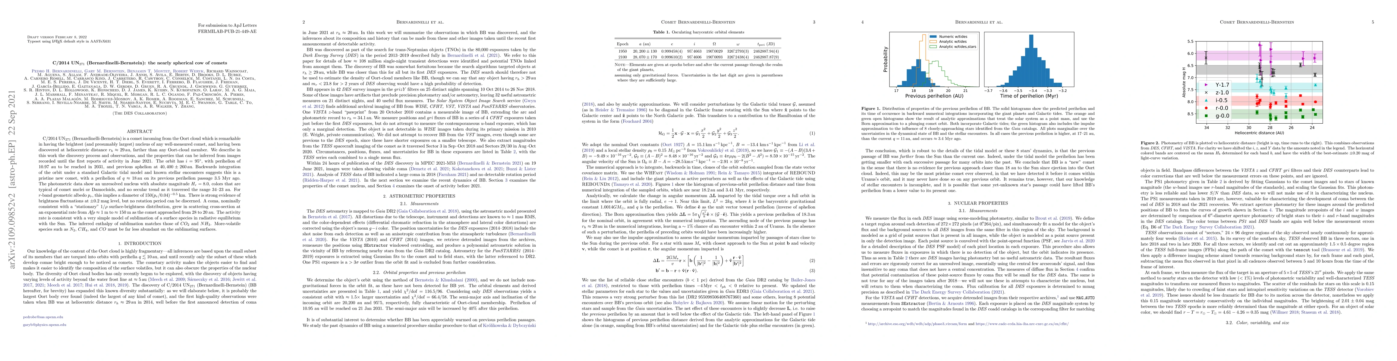 The research paper discusses C/2014 UN271 (Bernardinelli-Bernstein), a massive, distant comet from the Oort cloud. It highlights the comet's exceptional size, with a nucleus inferred to be 150 km in diameter, and its unique properties, such as a lack of rotation period and brightness fluctuations. The study also details the comet's pristine nature, inferred from its orbit and past perihelion passage, and its activity model consistent with sublimation of surface species like CO2 and NH3. The comet was discovered at a record-breaking distance from the Sun, providing insights into the outer solar system.