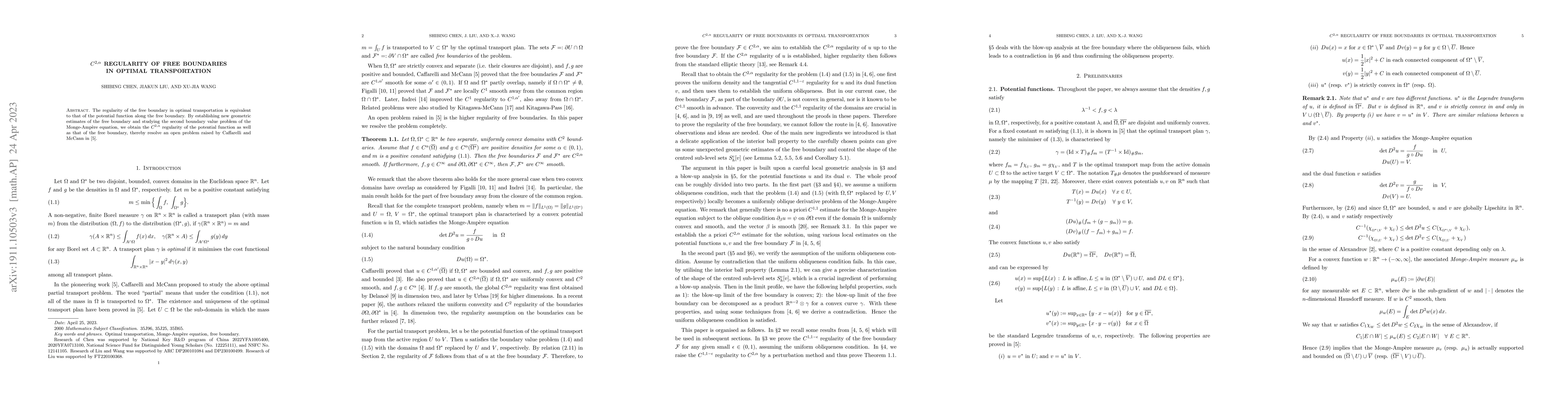 This paper establishes $C^{2,\alpha}$ regularity for the free boundary in optimal transportation by deriving new geometric estimates and solving the second boundary value problem of the Monge-Ampère equation, resolving an open problem posed by Caffarelli and McCann.