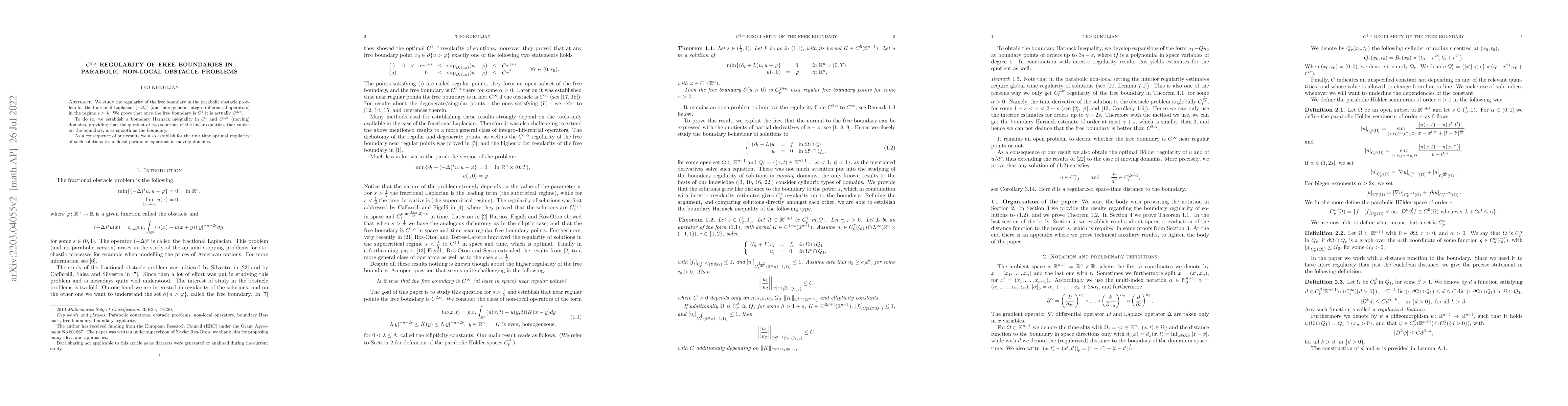 The paper employs a combination of analytical techniques, including boundary Harnack inequalities and regularity estimates for solutions to integro-differential equations, to study the $C^{2,\alpha}$ regularity of free boundaries in parabolic non-local obstacle problems involving the fractional Laplacian.
