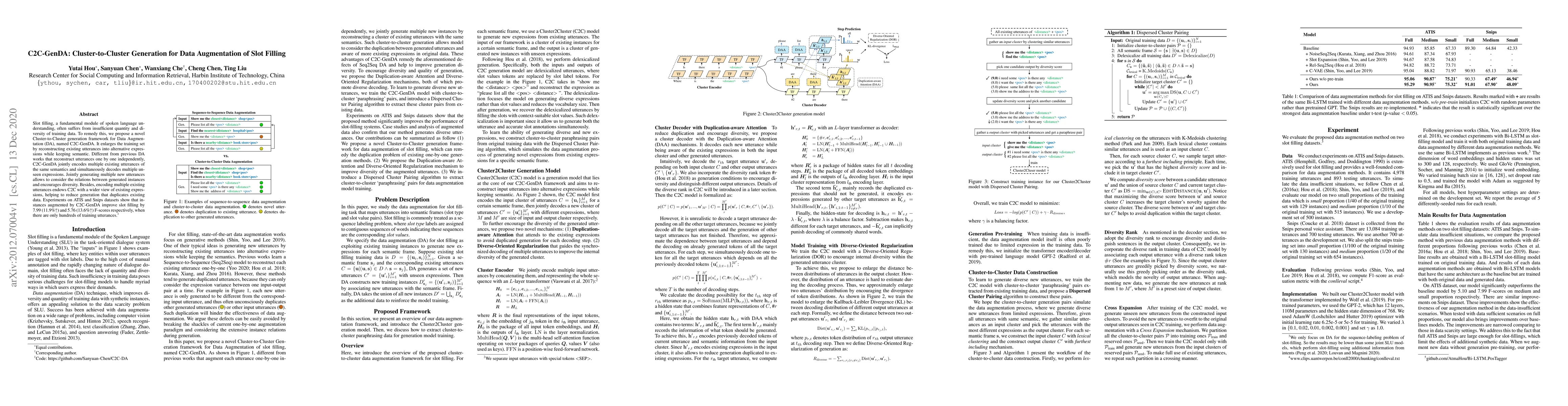 Slot filling, a fundamental module of spoken language understanding, often suffers from insufficient quantity and diversity of training data. To remedy this, we propose a novel Cluster-to-Cluster generation framework for Data Augmentation (DA), named C2C-GenDA. It enlarges the training set by reconstructing existing utterances into alternative expressions while keeping semantic. Different from previous DA works that reconstruct utterances one by one independently, C2C-GenDA jointly encodes multiple existing utterances of the same semantics and simultaneously decodes multiple unseen expressions. Jointly generating multiple new utterances allows to consider the relations between generated instances and encourages diversity. Besides, encoding multiple existing utterances endows C2C with a wider view of existing expressions, helping to reduce generation that duplicates existing data. Experiments on ATIS and Snips datasets show that instances augmented by C2C-GenDA improve slot filling by 7.99 (11.9%) and 5.76 (13.6%) F-scores respectively, when there are only hundreds of training utterances.