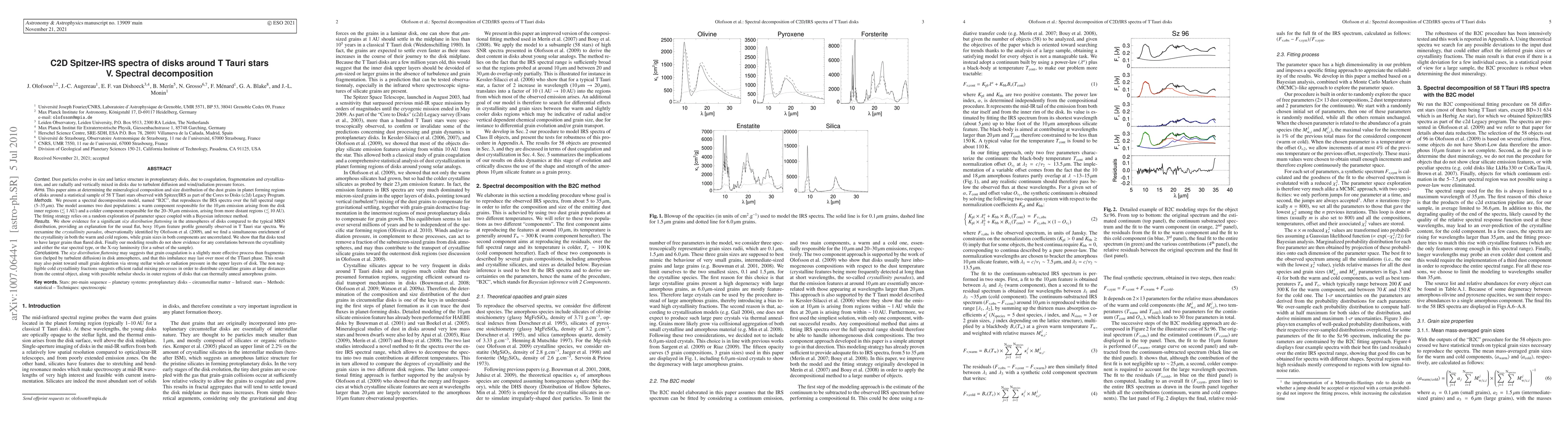 This paper uses Spitzer-IRS spectra to analyze dust grain composition and size distribution in protoplanetary disks around 58 T Tauri stars, revealing a flattened size distribution and simultaneous enrichment of crystallinity in both warm and cold disk regions, suggesting effective coagulation and radial mixing processes.