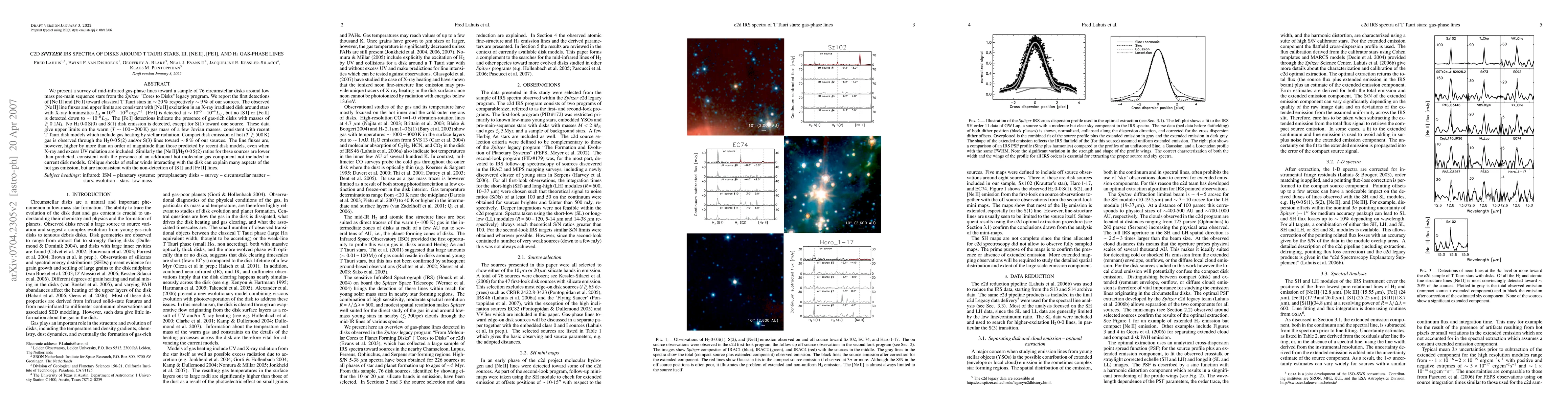 We present a survey of mid-infrared gas-phase lines toward a sample of 76 circumstellar disks around low mass pre-main sequence stars from the Spitzer "Cores to Disks" legacy program. We report the first detections of [Ne II] and [Fe I] toward classical T Tauri stars in ~20% respectively ~9% of our sources. The observed [Ne II] line fluxes and upper limits are consistent with [Ne II] excitation in an X-ray irradiated disk around stars with X-ray luminosities L_X=10^{29}-10^{31} erg s^{-1}. [Fe I] is detected at ~10^-5-10^-4 L_Sun, but no [S I] or [Fe II] is detected down to ~10^{-6} L_Sun. The [Fe I] detections indicate the presence of gas-rich disks with masses of >~0.1 M_J. No H_2 0-0 S(0) and S(1) disk emission is detected, except for S(1) toward one source. These data give upper limits on the warm (T~100-200K) gas mass of a few Jovian masses, consistent with recent T Tauri disk models which include gas heating by stellar radiation. Compact disk emission of hot (T>~500K) gas is observed through the H_2 0-0 S(2) and/or S(3) lines toward ~8% of our sources. The line fluxes are, however, higher by more than an order of magnitude than those predicted by recent disk models, even when X-ray and excess UV radiation are included. Similarly the [Ne II]/H_2 0-0 S(2) ratios for these sources are lower than predicted, consistent with the presence of an additional hot molecular gas component not included in current disk models. Oblique shocks of stellar winds interacting with the disk can explain many aspects of the hot gas emission, but are inconsistent with the non-detection of [S I] and [Fe II] lines.