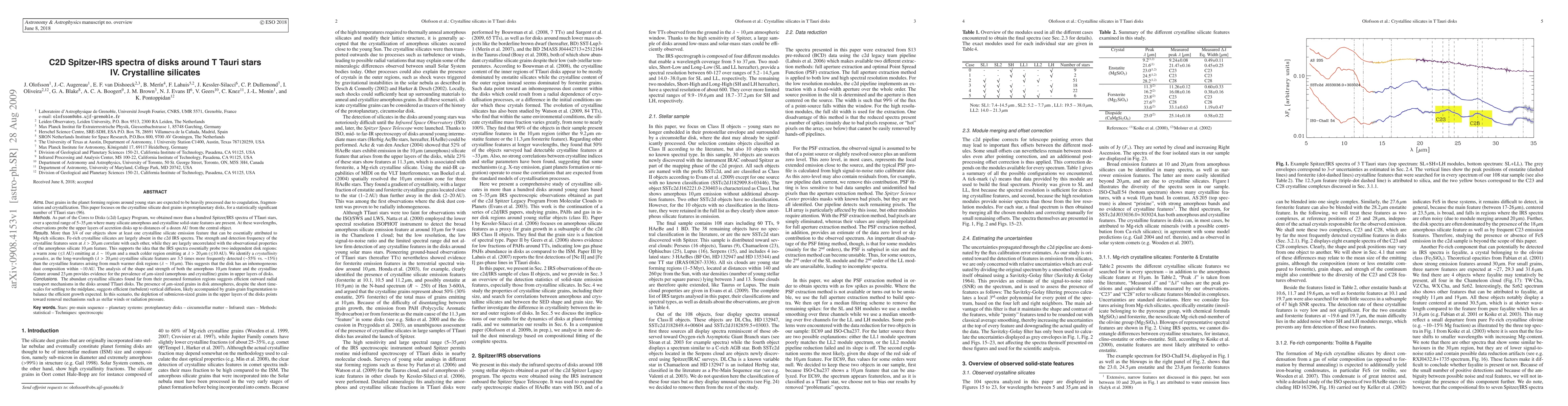 This study analyzes Spitzer-IRS spectra of T Tauri stars, revealing that over 75% exhibit crystalline silicate features indicative of Mg-rich silicates, suggesting efficient radial transport of these grains. The paper identifies a crystallinity paradox, with long-wavelength crystalline features being more prevalent than those from warmer regions, indicating inhomogeneous dust composition within ~10 AU.