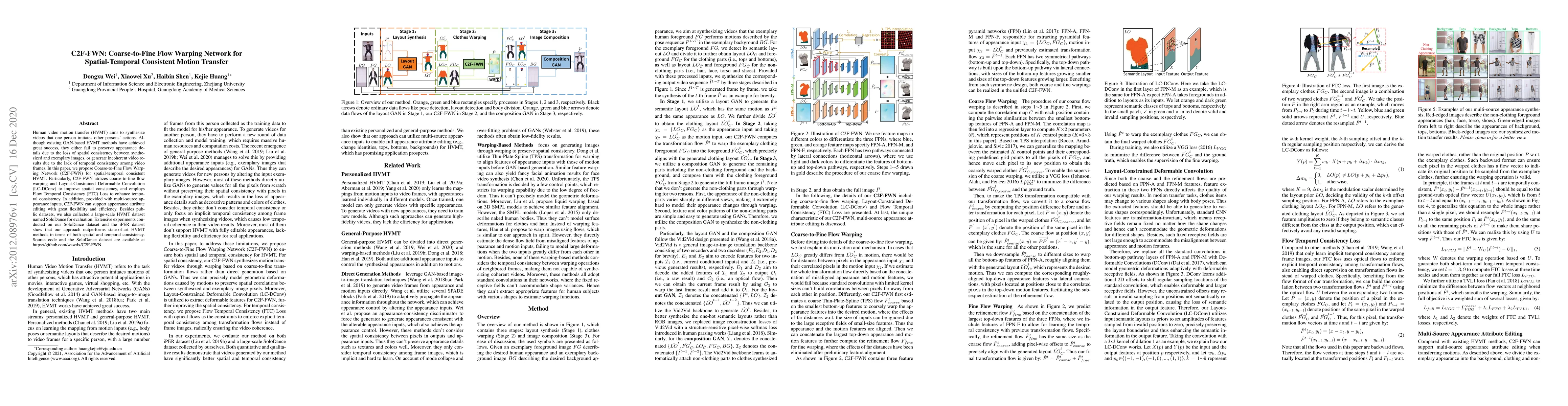 The paper proposes a Coarse-to-Fine Flow Warping Network (C2F-FWN) to achieve spatial-temporal consistent human video motion transfer, addressing issues of appearance and temporal coherence in existing GAN-based methods. The approach utilizes flow warping and deformable convolution for spatial consistency and a temporal consistency loss for improved video frame coherence.