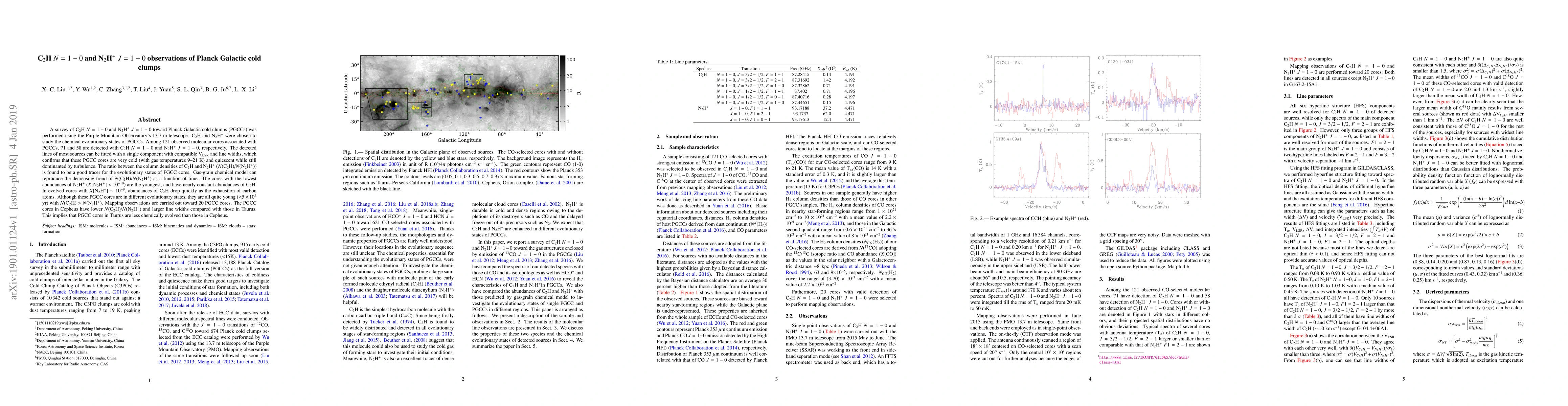 This study observes C2H and N2H+ in Planck Galactic cold clumps, finding that younger cores have lower N2H+ abundances and older cores show a decrease in C2H abundance as carbon is exhausted.