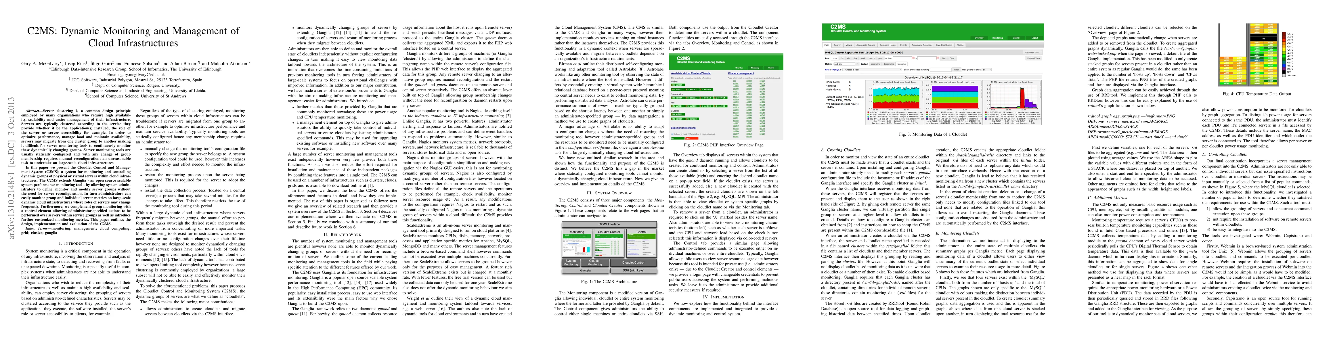 The paper introduces C2MS, an extension of Ganglia for dynamic monitoring and management of cloud infrastructures, enabling administrators to monitor and control server groups without manual reconfiguration, thus facilitating performance optimization and load management in large-scale, frequently changing cloud environments. The system allows for automated monitoring and customized control actions over server groups, enhancing scalability and availability.