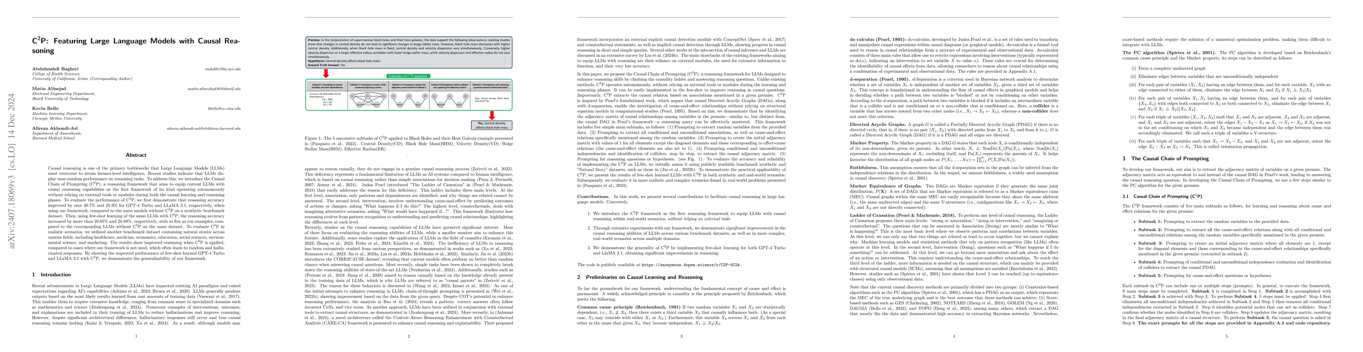 This paper introduces the Causal Chain of Prompting (C2P) framework to enhance large language models' (LLMs) causal reasoning abilities, showing significant improvements in causal learning and reasoning accuracy across various domains. The C2P method can be integrated during LLM training, resulting in a 33% increase in reasoning accuracy over existing models, even with few-shot learning examples.
