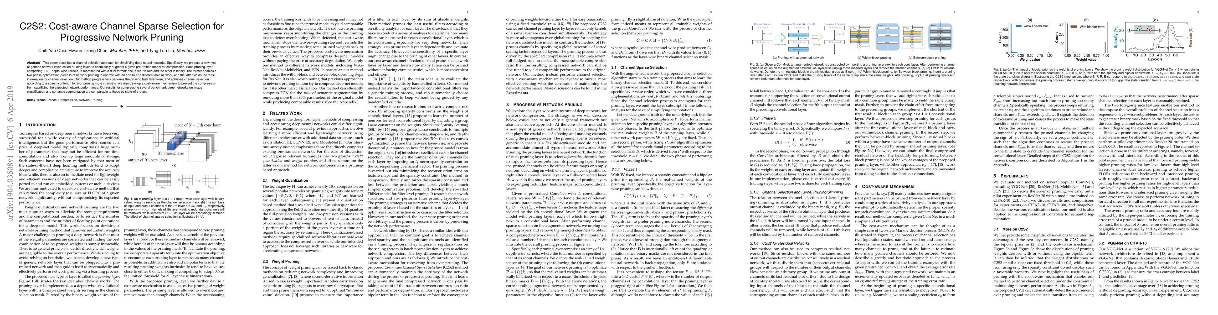 This paper proposes a novel channel-selection method for deep neural network compression using a pruning layer with dual formats for optimization and mask information. The method progressively prunes channels according to a sparsity criterion while maintaining performance through a cost-aware mechanism.