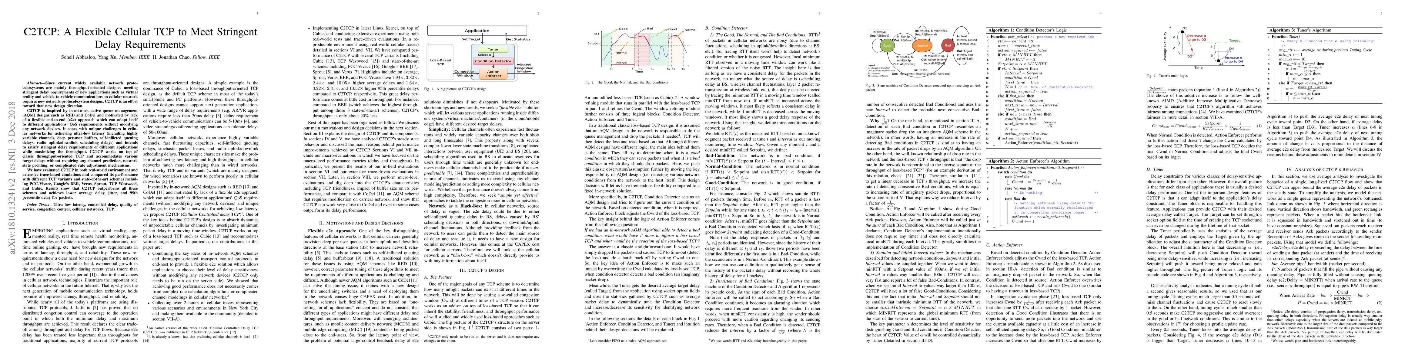 C2TCP is a novel cellular TCP protocol designed to meet stringent delay requirements of applications like virtual reality and vehicle-to-vehicle communications by adapting to various QoS needs without modifying network devices. It outperforms existing TCP variants and state-of-the-art schemes in terms of lower average delay, jitter, and percentile delay.