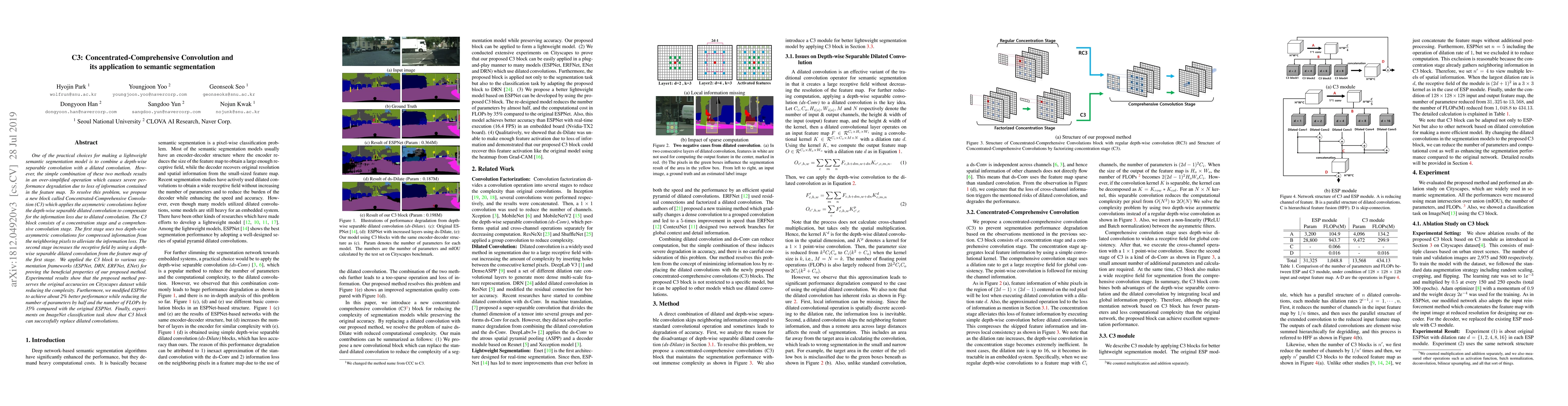One of the practical choices for making a lightweight semantic segmentation model is to combine a depth-wise separable convolution with a dilated convolution. However, the simple combination of these two methods results in an over-simplified operation which causes severe performance degradation due to loss of information contained in the feature map. To resolve this problem, we propose a new block called Concentrated-Comprehensive Convolution (C3) which applies the asymmetric convolutions before the depth-wise separable dilated convolution to compensate for the information loss due to dilated convolution. The C3 block consists of a concentration stage and a comprehensive convolution stage. The first stage uses two depth-wise asymmetric convolutions for compressed information from the neighboring pixels to alleviate the information loss. The second stage increases the receptive field by using a depth-wise separable dilated convolution from the feature map of the first stage. We applied the C3 block to various segmentation frameworks (ESPNet, DRN, ERFNet, ENet) for proving the beneficial properties of our proposed method. Experimental results show that the proposed method preserves the original accuracies on Cityscapes dataset while reducing the complexity. Furthermore, we modified ESPNet to achieve about 2% better performance while reducing the number of parameters by half and the number of FLOPs by 35% compared with the original ESPNet. Finally, experiments on ImageNet classification task show that C3 block can successfully replace dilated convolutions.