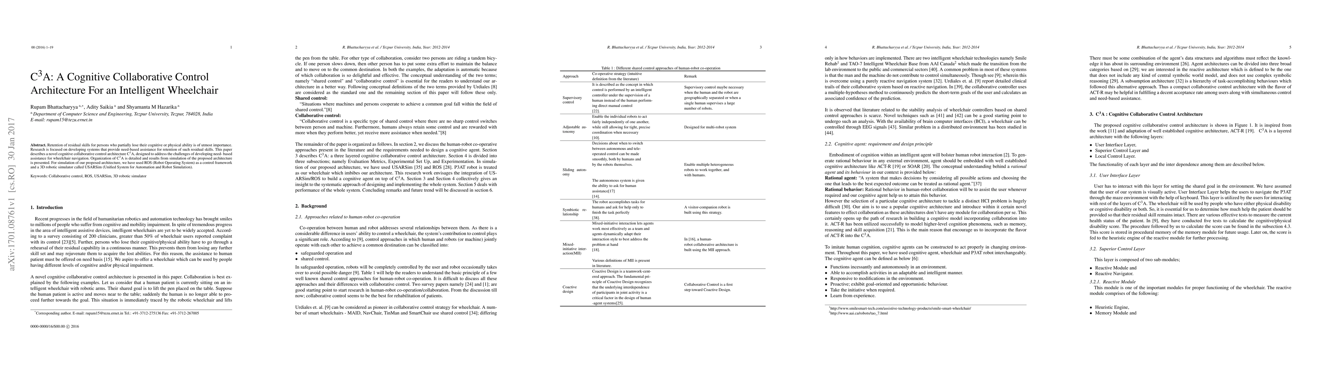 Retention of residual skills for persons who partially lose their cognitive or physical ability is of utmost importance. Research is focused on developing systems that provide need-based assistance for retention of such residual skills. This paper describes a novel cognitive collaborative control architecture C3A, designed to address the challenges of developing need- based assistance for wheelchair navigation. Organization of C3A is detailed and results from simulation of the proposed architecture is presented. For simulation of our proposed architecture, we have used ROS (Robot Operating System) as a control framework and a 3D robotic simulator called USARSim (Unified System for Automation and Robot Simulation).