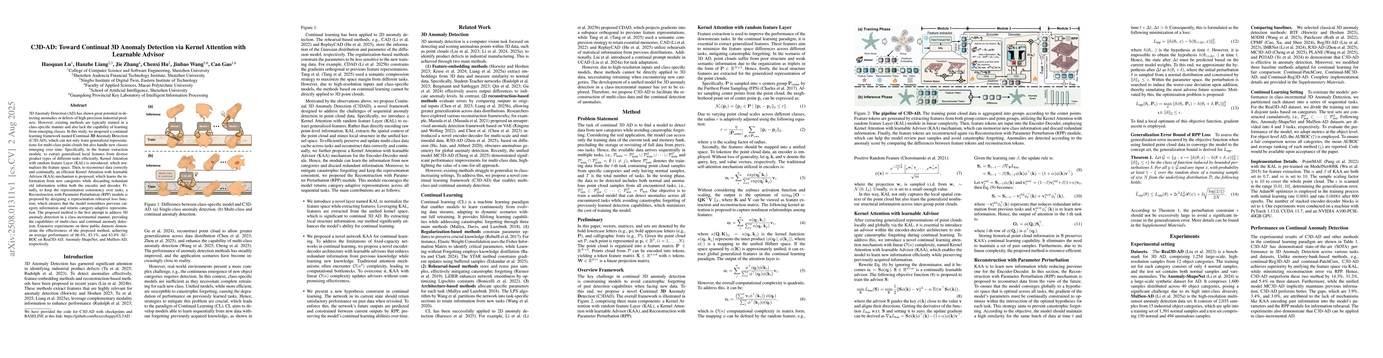 3D Anomaly Detection (AD) has shown great potential in detecting anomalies or defects of high-precision industrial products. However, existing methods are typically trained in a class-specific manner and also lack the capability of learning from emerging classes. In this study, we proposed a continual learning framework named Continual 3D Anomaly Detection (C3D-AD), which can not only learn generalized representations for multi-class point clouds but also handle new classes emerging over time.Specifically, in the feature extraction module, to extract generalized local features from diverse product types of different tasks efficiently, Kernel Attention with random feature Layer (KAL) is introduced, which normalizes the feature space. Then, to reconstruct data correctly and continually, an efficient Kernel Attention with learnable Advisor (KAA) mechanism is proposed, which learns the information from new categories while discarding redundant old information within both the encoder and decoder. Finally, to keep the representation consistency over tasks, a Reconstruction with Parameter Perturbation (RPP) module is proposed by designing a representation rehearsal loss function, which ensures that the model remembers previous category information and returns category-adaptive representation.Extensive experiments on three public datasets demonstrate the effectiveness of the proposed method, achieving an average performance of 66.4%, 83.1%, and 63.4% AUROC on Real3D-AD, Anomaly-ShapeNet, and MulSen-AD, respectively.