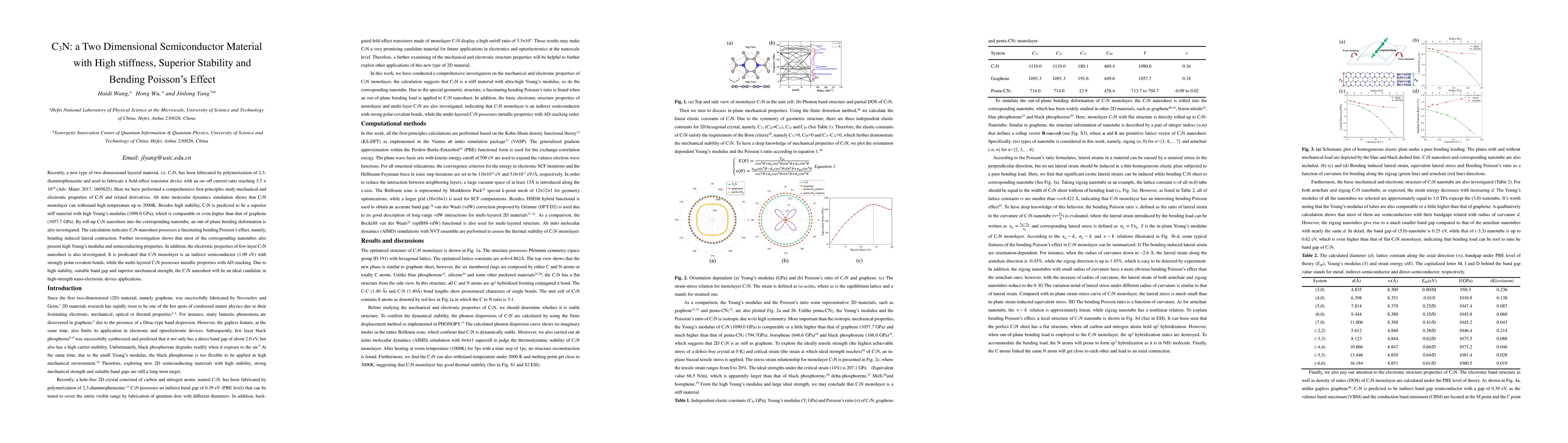 Recently, a new type of two-dimensional layered material, i.e. C3N, has been fabricated by polymerization of 2,3-diaminophenazine and used to fabricate a field-effect transistor device with an on/off current ratio reaching 5.5E10 (Adv. Mater. 2017, 1605625). Here we have performed a comprehensive first-principles study mechanical and electronic properties of C3N and related derivatives. Ab inito molecular dynamics simulation shows that C3N monolayer can withstand high temperature up to 2000K. Besides high stability, C3N is predicted to be a superior stiff material with high Young's modulus (1090.0 GPa), which is comparable or even higher than that of graphene (1057.7 GPa). By roll-up C3N nanosheet into the corresponding nanotube, an out-of-plane bending deformation is also investigated. The calculation indicates C3N nanosheet possesses a fascinating bending Poisson's effect, namely, bending induced lateral contraction. Further investigation shows that most of the corresponding nanotubes also present high Young's modulus and semiconducting properties. In addition, the electronic properties of few-layer C3N nanosheet is also investigated. It is predicated that C3N monolayer is an indirect semiconductor (1.09 eV) with strongly polar covalent bonds, while the multi-layered C3N possesses metallic properties with AD-stacking. Due to high stability, suitable band gap and superior mechanical strength, the C3N nanosheet will be an ideal candidate in high-strength nano-electronic device applications.