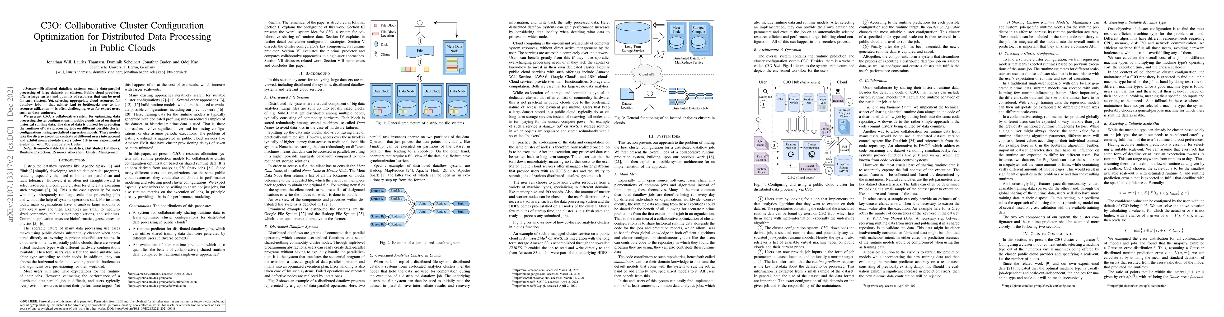 C3O is a system designed to optimize cluster configurations for distributed data processing in public clouds by leveraging shared historical runtime data. It employs specialized regression models to predict job runtimes across various cluster setups, achieving mean absolute errors below 3% in experiments with 930 unique Spark jobs.