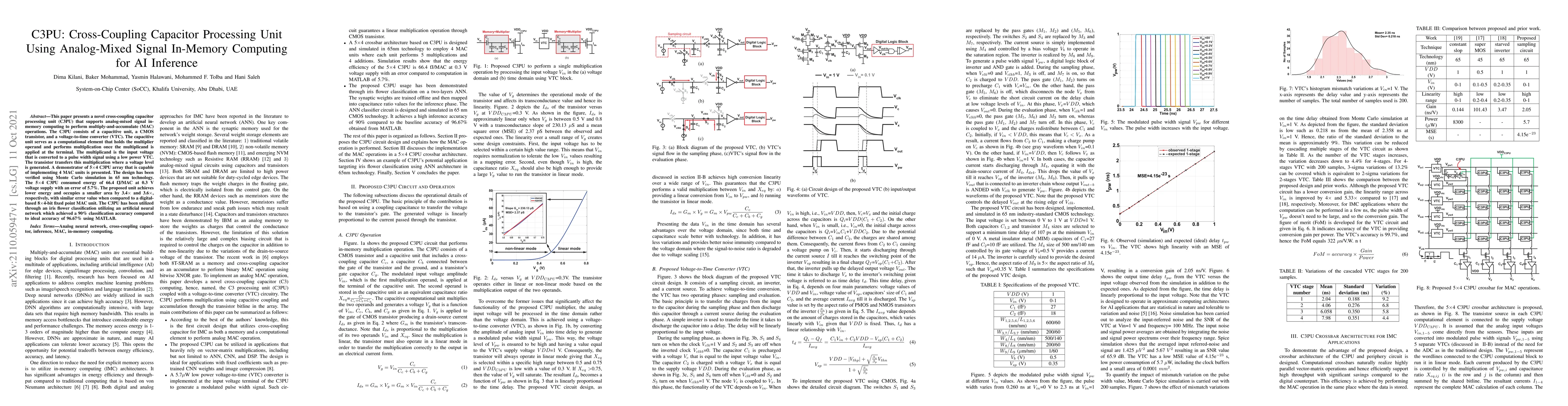 This paper introduces a novel cross-coupling capacitor processing unit (C3PU) for in-memory computing in AI inference, utilizing analog-mixed signal techniques to perform multiply-and-accumulate operations with lower energy and smaller area compared to digital methods. The demonstrator achieved 90% classification accuracy in iris flower classification.