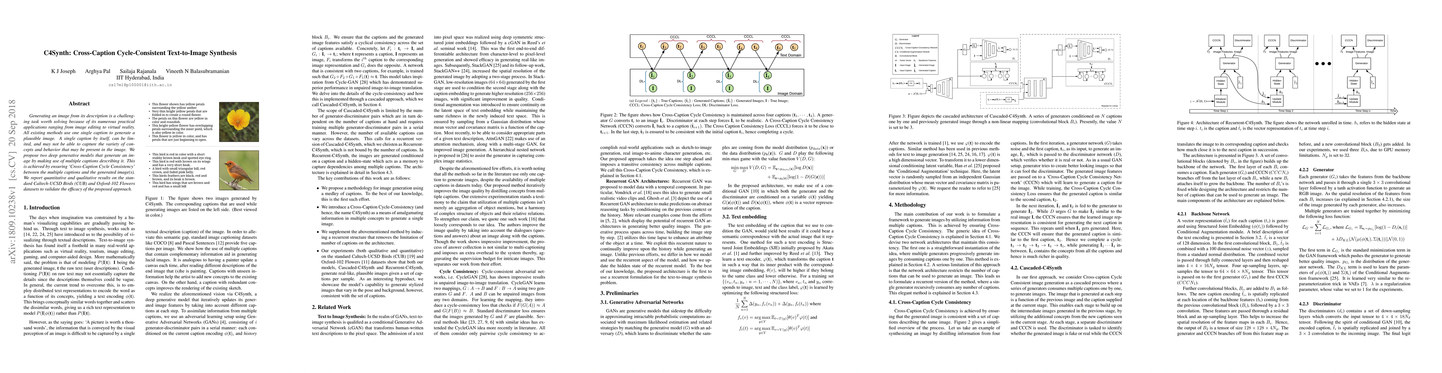 The paper introduces C4Synth, a method for generating images from multiple captions using cross-caption cycle consistency to capture diverse image concepts. The proposed approach is validated on Caltech-UCSD Birds and Oxford-102 Flowers datasets, demonstrating improved image synthesis over single-caption methods.