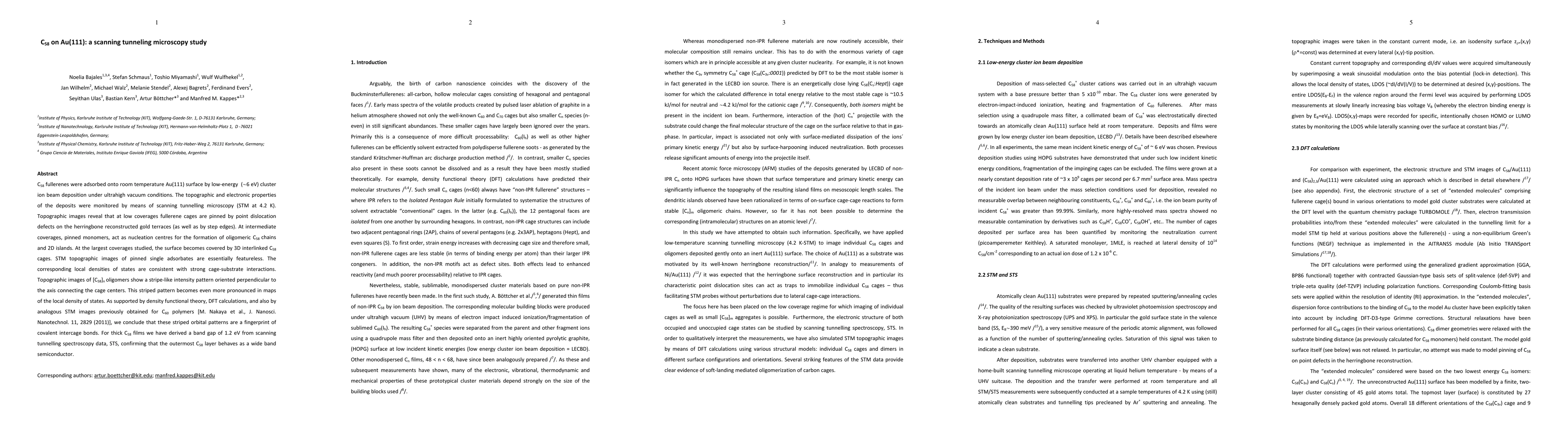 C58 fullerenes were adsorbed onto room temperature Au(111) surface by low-energy (~6 eV) cluster ion beam deposition under ultrahigh vacuum conditions. The topographic and electronic properties of the deposits were monitored by means of scanning tunnelling microscopy (STM at 4.2 K). Topographic images reveal that at low coverages fullerene cages are pinned by point dislocation defects on the herringbone reconstructed gold terraces (as well as by step edges). At intermediate coverages, pinned monomers, act as nucleation centres for the formation of oligomeric C58 chains and 2D islands. At the largest coverages studied, the surface becomes covered by 3D interlinked C58 cages. STM topographic images of pinned single adsorbates are essentially featureless. The corresponding local densities of states are consistent with strong cage-substrate interactions. Topographic images of [C58]n oligomers show a stripe-like intensity pattern oriented perpendicular to the axis connecting the cage centers. This striped pattern becomes even more pronounced in maps of the local density of states. As supported by density functional theory, DFT calculations, and also by analogous STM images previously obtained for C60 polymers (M. Nakaya et al., J. Nanosci. Nanotechnol. 11, 2829 (2011)), we conclude that these striped orbital patterns are a fingerprint of covalent intercage bonds. For thick C58 films we have derived a band gap of 1.2 eV from scanning tunnelling spectroscopy data, STS, confirming that the outermost C58 layer behaves as a wide band semiconductor.