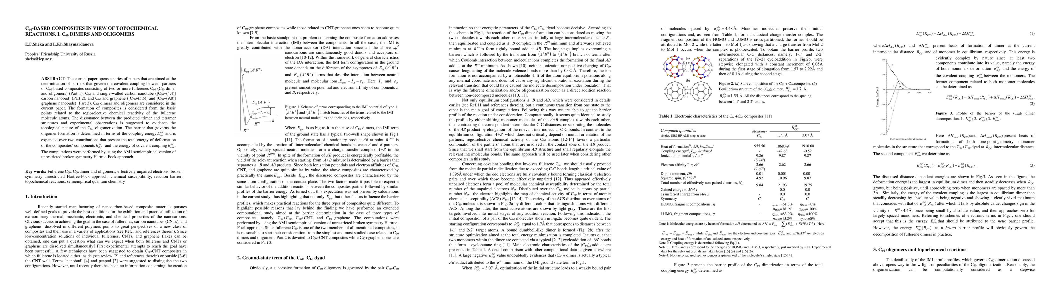 The current paper opens a series of papers that are aimed at the determination of barriers that govern the covalent coupling between partners of C60-based composites consisting of two or more fullerenes C60 (C60 dimer and oligomers) (Part 1), C60 and single-walled carbon nanotube ([C60+(4,4)] carbon nanobud) (Part 2), and C60 and graphene ([C60+(5,5)] and [C60+(9,8)] graphene nanobuds) (Part 3). C60 dimers and oligomers are considered in the current paper. The formation of composites is considered from the basic points related to the regioselective chemical reactivity of the fullerene molecule atoms. The dissonance between the predicted trimer and tetramer structures and experimental observations is suggested to evidence the topological nature of the C60 oligomerization. The barrier that governs the oligomer formation is determined in terms of the coupling energy and is expanded over two contributions that present the total energy of deformation of the composites' components and the energy of covalent coupling . The computations were performed by using the AM1 semiempirical version of unrestricted broken symmetry Hartree-Fock approach.