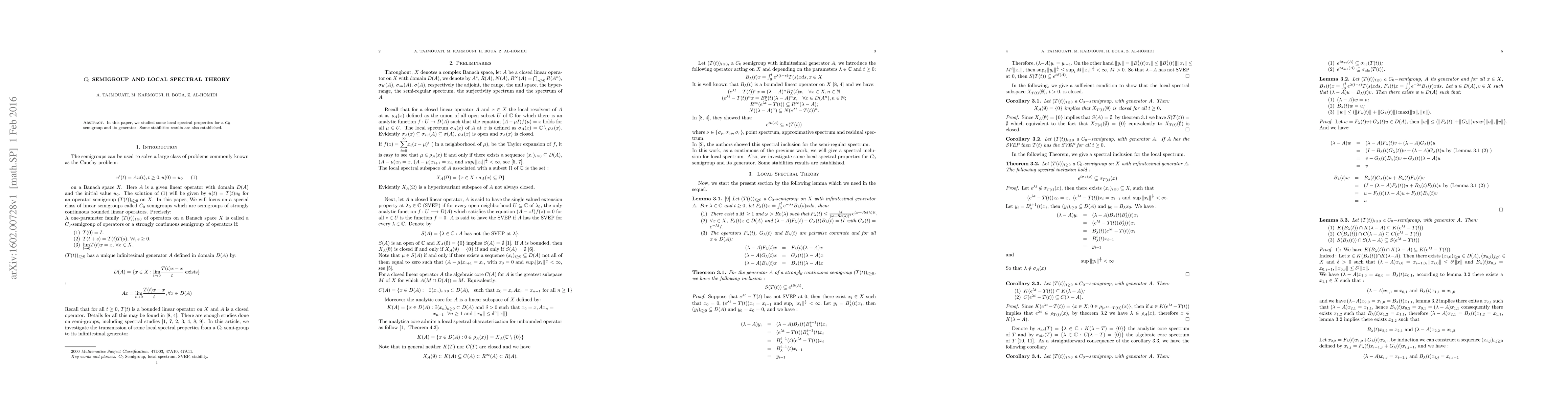 This paper explores local spectral properties of a Co semigroup and its generator, establishing stability results and advancements in local spectral theory.
