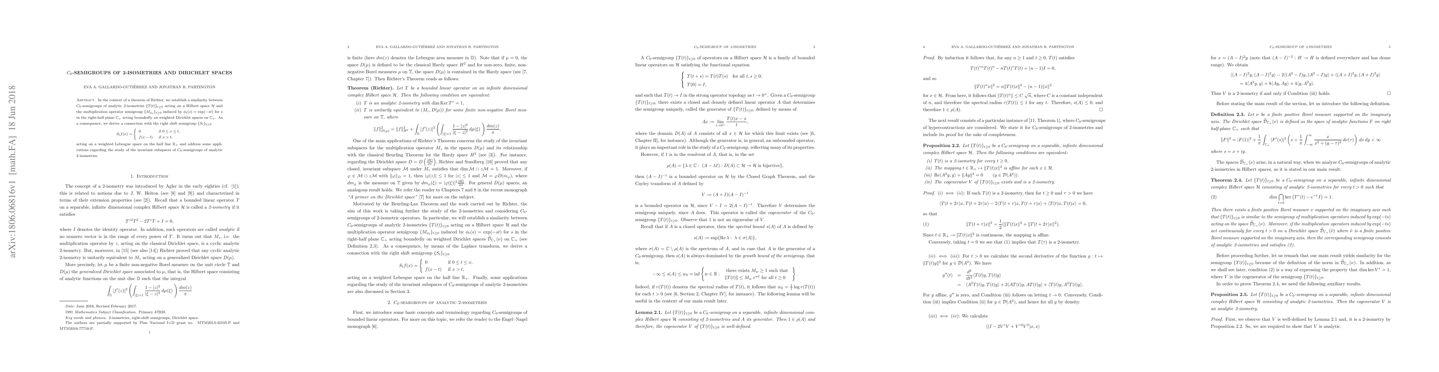 In the context of a theorem of Richter, we establish a similarity between $C_0$-semigroups of analytic 2-isometries $\{T(t)\}_{t\geq0}$ acting on a Hilbert space $\mathcal H$ and the multiplication operator semigroup $\{M_{\phi_t}\}_{t\geq 0}$ induced by $\phi_t(s)=\exp (-st)$ for $s$ in the right-half plane $\mathbb{C}_+$ acting boundedly on weighted Dirichlet spaces on $\mathbb{C}_+$. As a consequence, we derive a connection with the right shift semigroup $\{S_t\}_{t\geq 0}$ $$ S_tf(x)=\left \{ \begin{array}{ll} 0 & \mbox { if }0\leq t\leq x, \\ f(x-t)& \mbox { if } x>t, \end{array} \right . $$ acting on a weighted Lebesgue space on the half line $\mathbb{R}_+$ and address some applications regarding the study of the invariant subspaces of $C_0$-semigroups of analytic 2-isometries.