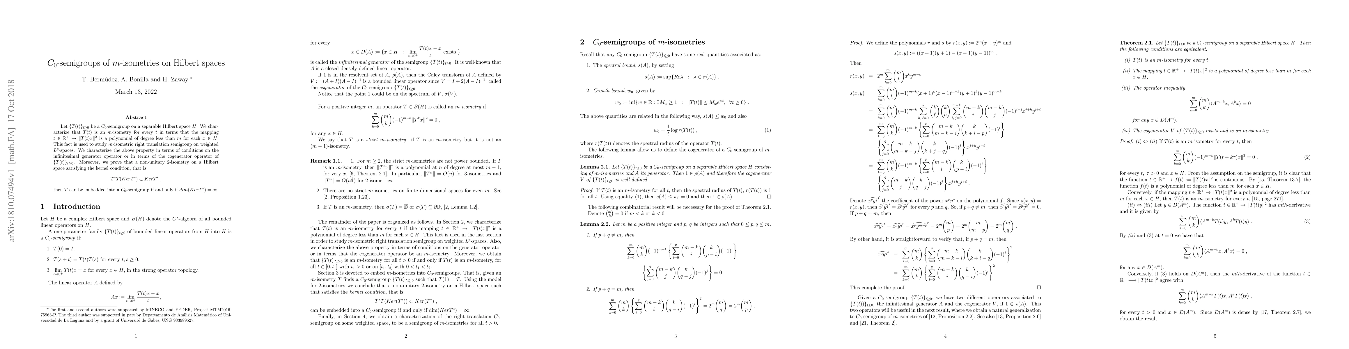 Let $\{T(t)\}_{t\ge 0}$ be a $C_0$-semigroup on a separable Hilbert space $H$. We characterize that $T(t)$ is an $m$-isometry for every $t$ in terms that the mapping $t\in \Bbb R^+ \rightarrow \|T(t)x\|^2$ is a polynomial of degree less than $m$ for each $x\in H$. This fact is used to study $m$-isometric right translation semigroup on weighted $L^p$-spaces. We characterize the above property in terms of conditions on the infinitesimal generator operator or in terms of the cogenerator operator of $\{ T(t)\}_{t\geq 0}$. Moreover, we prove that a non-unitary $2$-isometry on a Hilbert space satisfying the kernel condition, that is, $$ T^*T(KerT^*)\subset KerT^*\;, $$ then $T$ can be embedded into a $C_0$-semigroup if and only if $dim (KerT^*)=\infty$.