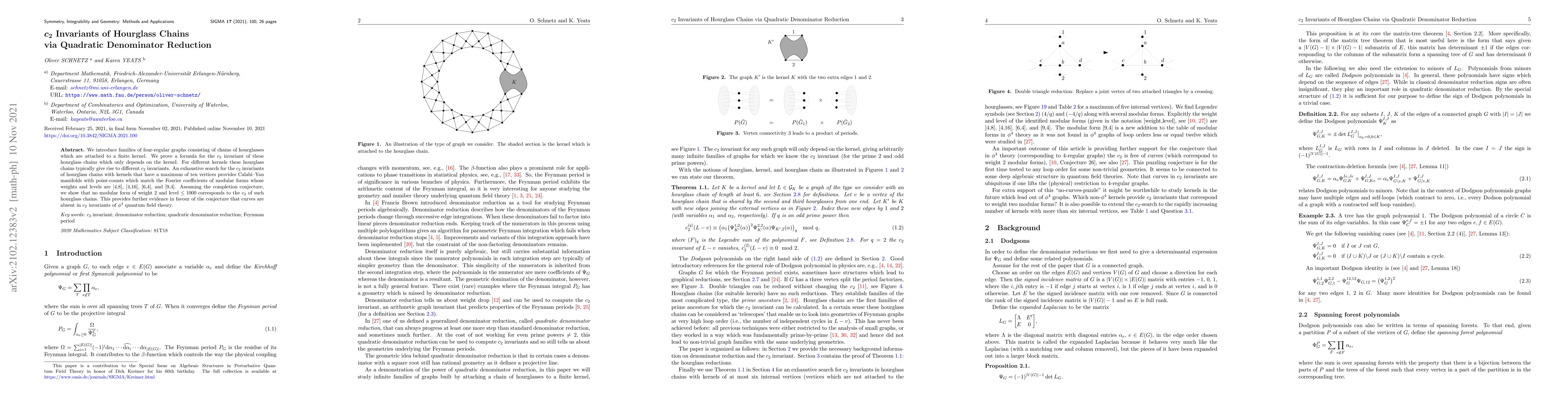 We introduce families of four-regular graphs consisting of chains of hourglasses which are attached to a finite kernel. We prove a formula for the $c_2$ invariant of these hourglass chains which only depends on the kernel. For different kernels these hourglass chains typically give rise to different $c_2$ invariants. An exhaustive search for the $c_2$ invariants of hourglass chains with kernels that have a maximum of ten vertices provides Calabi-Yau manifolds with point-counts which match the Fourier coefficients of modular forms whose weights and levels are [4,8], [4,16], [6,4], and [9,4]. Assuming the completion conjecture, we show that no modular form of weight 2 and level $\leq1000$ corresponds to the $c_2$ of such hourglass chains. This provides further evidence in favour of the conjecture that curves are absent in $c_2$ invariants of $\phi^4$ quantum field theory.