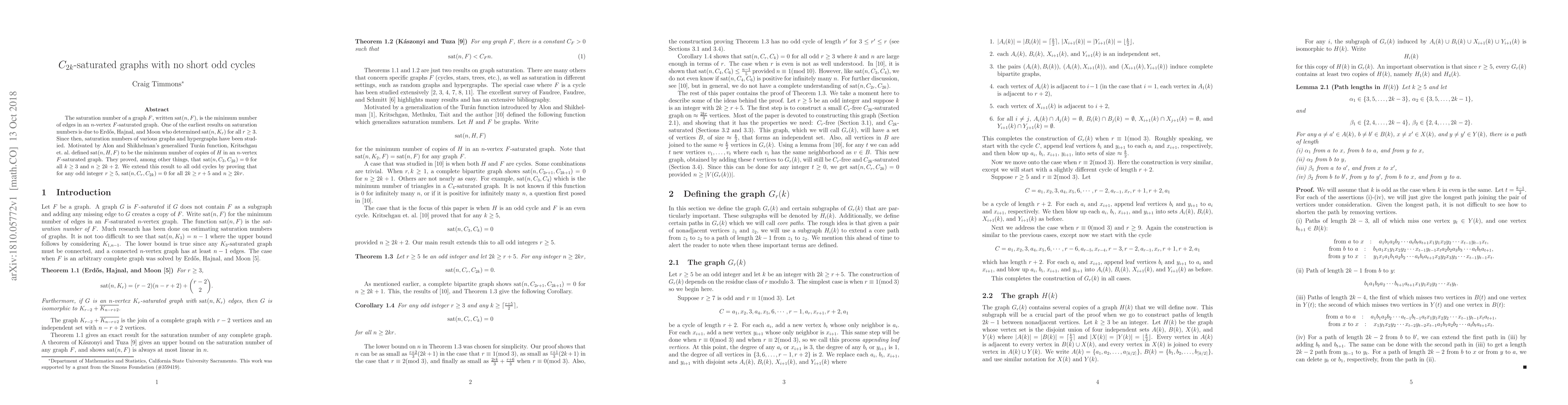This paper extends the result on saturation numbers for avoiding short odd cycles in graphs, proving that $\textup{sat}(n, C_r,C_{2k}) = 0$ for any odd integer $r \geq 5$ and $n \geq 2kr$, when $2k \geq r+5$. This indicates that no edges need to be added to an $n$-vertex graph to avoid creating a short odd cycle while maintaining no $C_{2k}$ cycles.