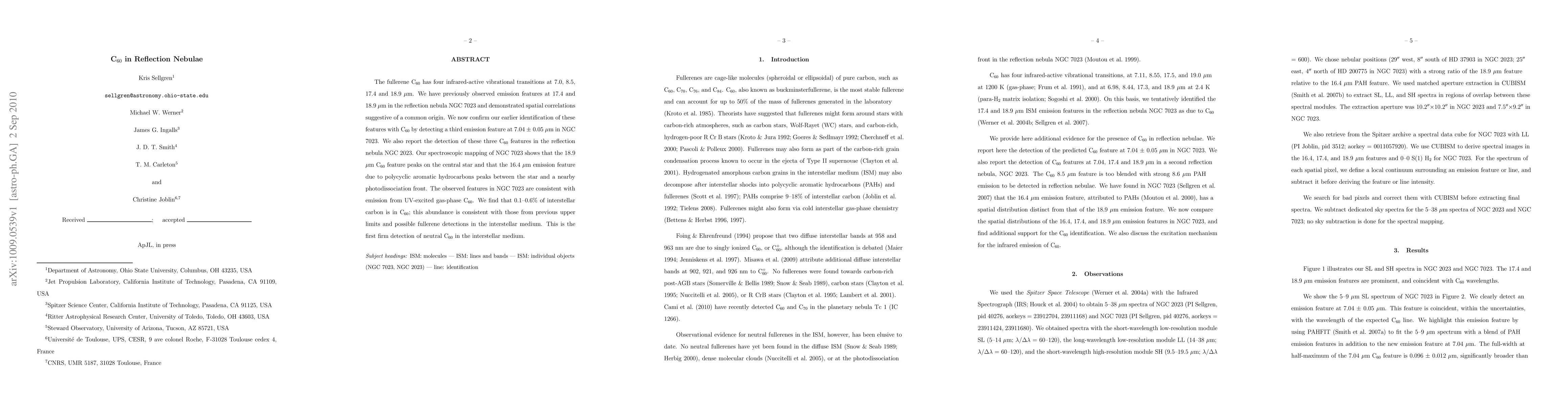 This paper confirms the presence of C$_{60}$ fullerene in two reflection nebulae, NGC 7023 and NGC 2023, by detecting three of its infrared-active vibrational transitions. The findings support the hypothesis that C$_{60}$ is formed in UV-excited gas-phase environments, representing 0.1-0.6% of interstellar carbon.