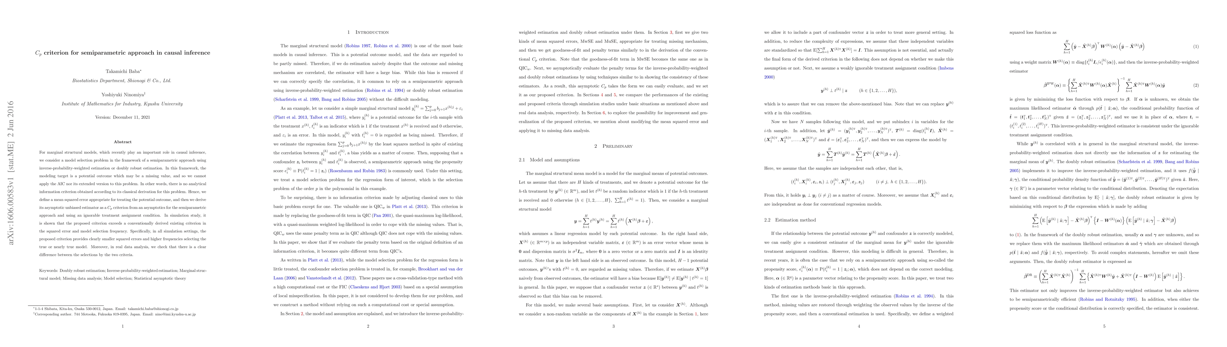 This paper proposes a new $C_p$ criterion for model selection in semiparametric marginal structural models used in causal inference, addressing the lack of applicable information criteria for potential outcomes. Simulation studies show that the proposed criterion outperforms existing methods in terms of squared error and model selection accuracy.