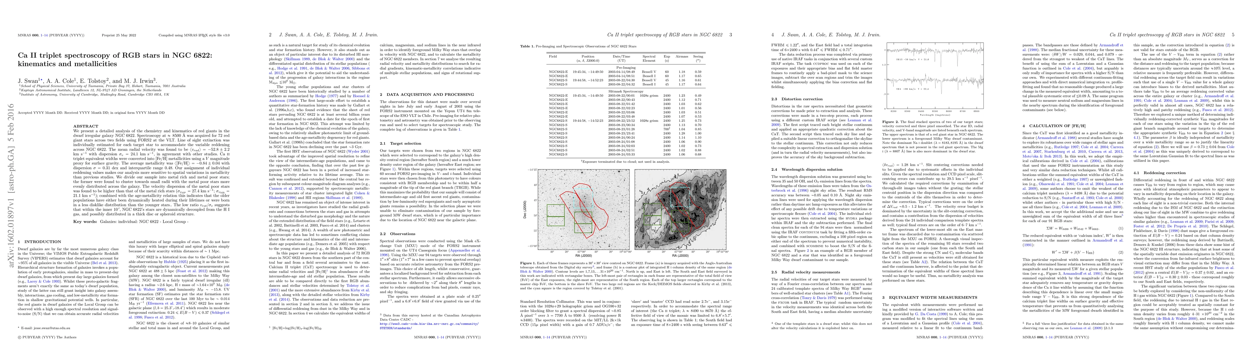 We present a detailed analysis of the chemistry and kinematics of red giants in the dwarf irregular galaxy NGC 6822. Spectroscopy at 8500 Angstroms was acquired for 72 red giant stars across two fields using FORS2 at the VLT. Line of sight extinction was individually estimated for each target star to accommodate the variable reddening across NGC 6822. The mean radial velocity was found to be v_helio = (52.8 +/- 2.2) km/s with dispersion rms = 24.1 km/s, in agreement with other studies. Ca II triplet equivalent widths were converted into [Fe/H] metallicities using a V magnitude proxy for surface gravity. The average metallicity was [Fe/H] = (-0.84 +/- 0.04) with dispersion rms = 0.31 dex and interquartile range 0.48. Our assignment of individual reddening values makes our analysis more sensitive to spatial variations in metallicity than previous studies. We divide our sample into metal-rich and metal-poor stars; the former are found to cluster towards small radii with the metal-poor stars more evenly distributed across the galaxy. The velocity dispersion of the metal-poor stars is higher than that of the metal-rich stars; combined with the age-metallicity relation this indicates that older populations have either been dynamically heated or were born in a less disclike distribution. The low ratio (v_rot/v_rms) suggests that within the inner 10', NGC 6822's stars are dynamically decoupled from the HI gas, possibly in a thick disc or spheroid.