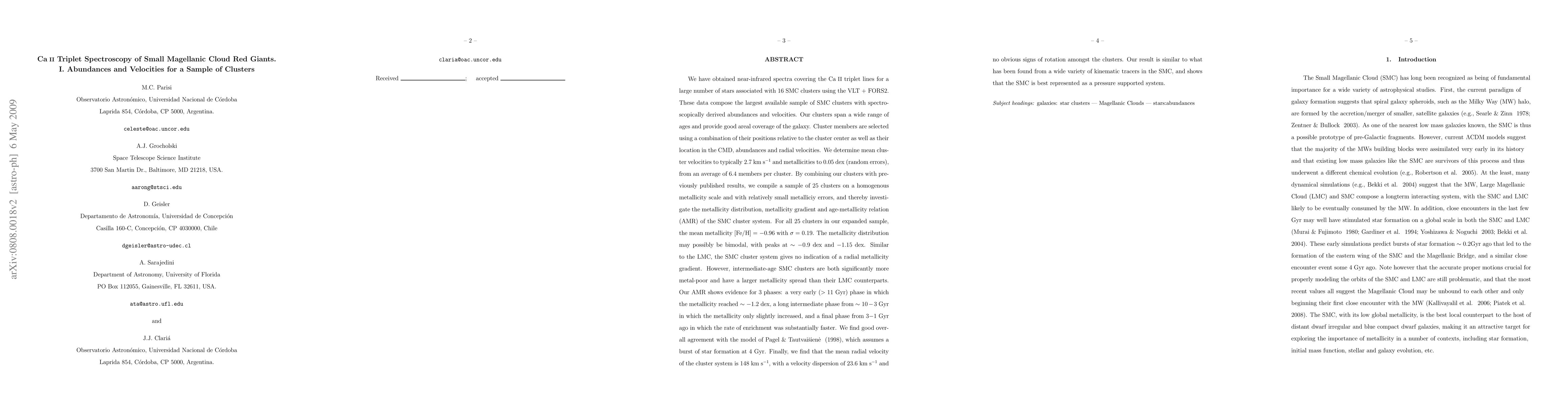 This paper presents the largest sample of Small Magellanic Cloud (SMC) clusters with spectroscopically derived abundances and velocities, obtained using VLT + FORS2 near-infrared spectra of the Ca II triplet lines. The study provides mean cluster velocities to 2.7 km/s and metallicities to 0.05 dex, with an average of 6.4 members per cluster.