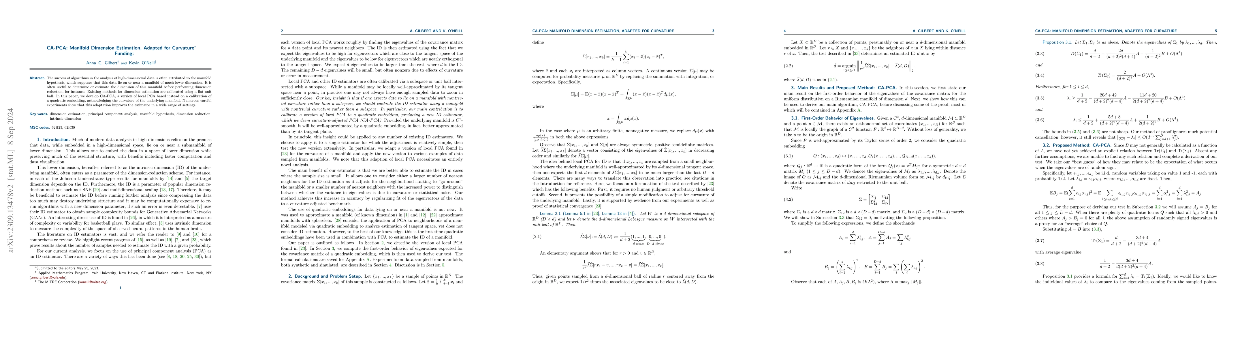 CA-PCA is a novel method for estimating the manifold dimension by adapting local PCA to a quadratic embedding, accounting for the underlying manifold's curvature, which improves estimation accuracy over traditional methods calibrated on a flat unit ball. Experimental results demonstrate enhanced performance across various settings.