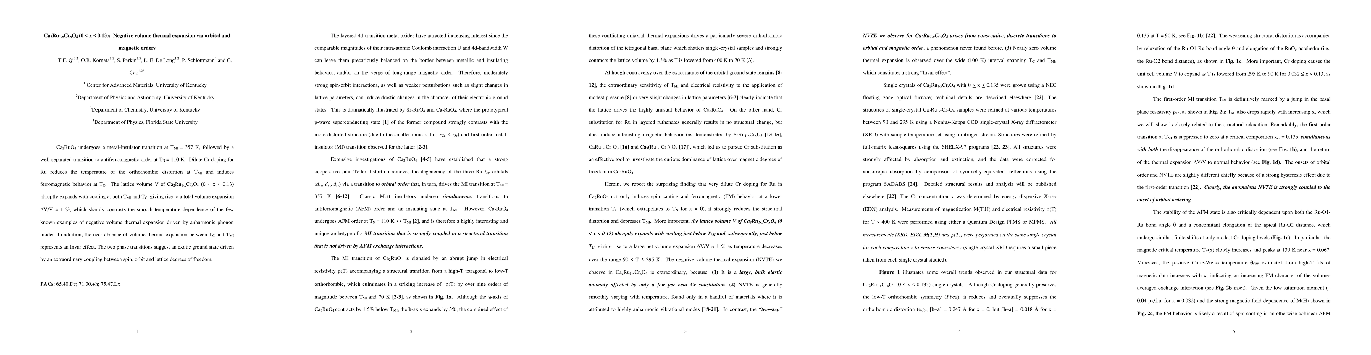 This study investigates Ca2Ru1-xCrxO4 (0 < x < 0.13) where Cr doping induces negative volume thermal expansion via orbital and magnetic orders, contrasting typical phonon-driven mechanisms. The material exhibits an Invar effect and a significant volume expansion at phase transitions, indicating a unique coupling between spin, orbit, and lattice dynamics.