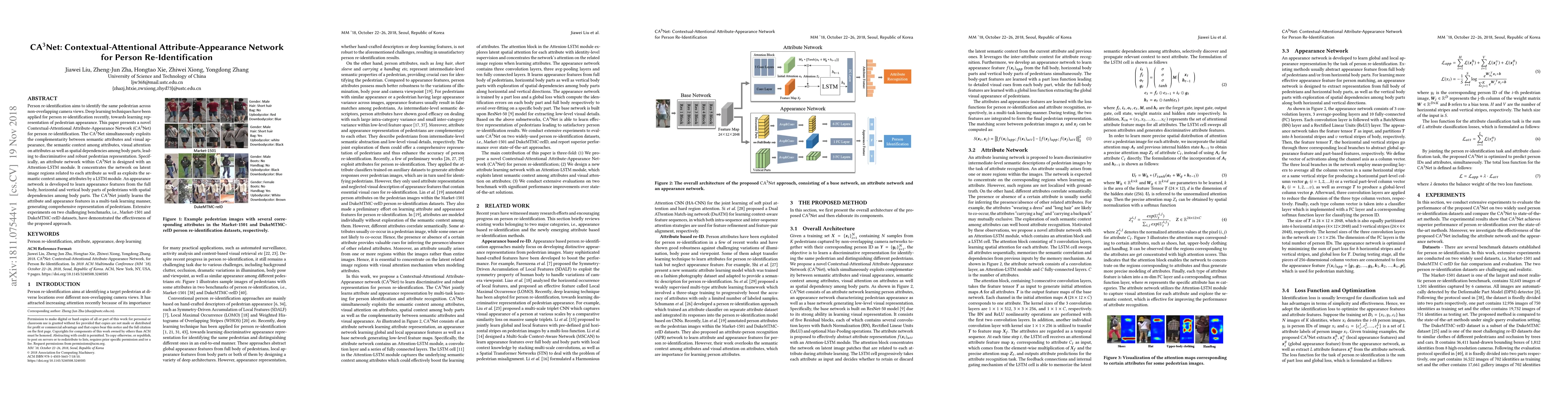 CA3Net integrates semantic attributes and visual appearance through an attribute network with an Attention-LSTM module and an appearance network considering spatial dependencies, achieving robust pedestrian representation for person re-identification. Experiments on Market-1501 and DukeMTMC-reID datasets validate its effectiveness.