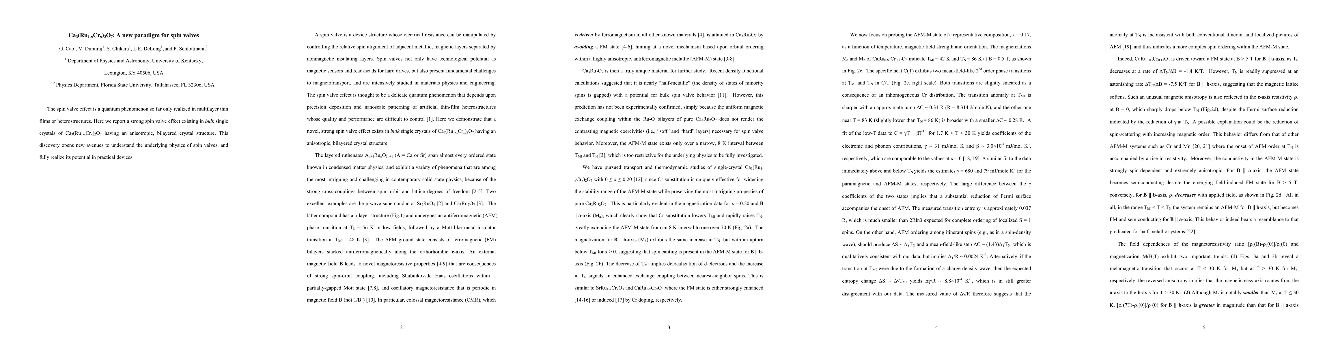 This paper reports a strong spin valve effect in bulk single crystals of Ca3(Ru1-xCrx)2O7, challenging previous limitations to multilayer thin films. This discovery provides new insights into the physics of spin valves and their potential for practical applications.